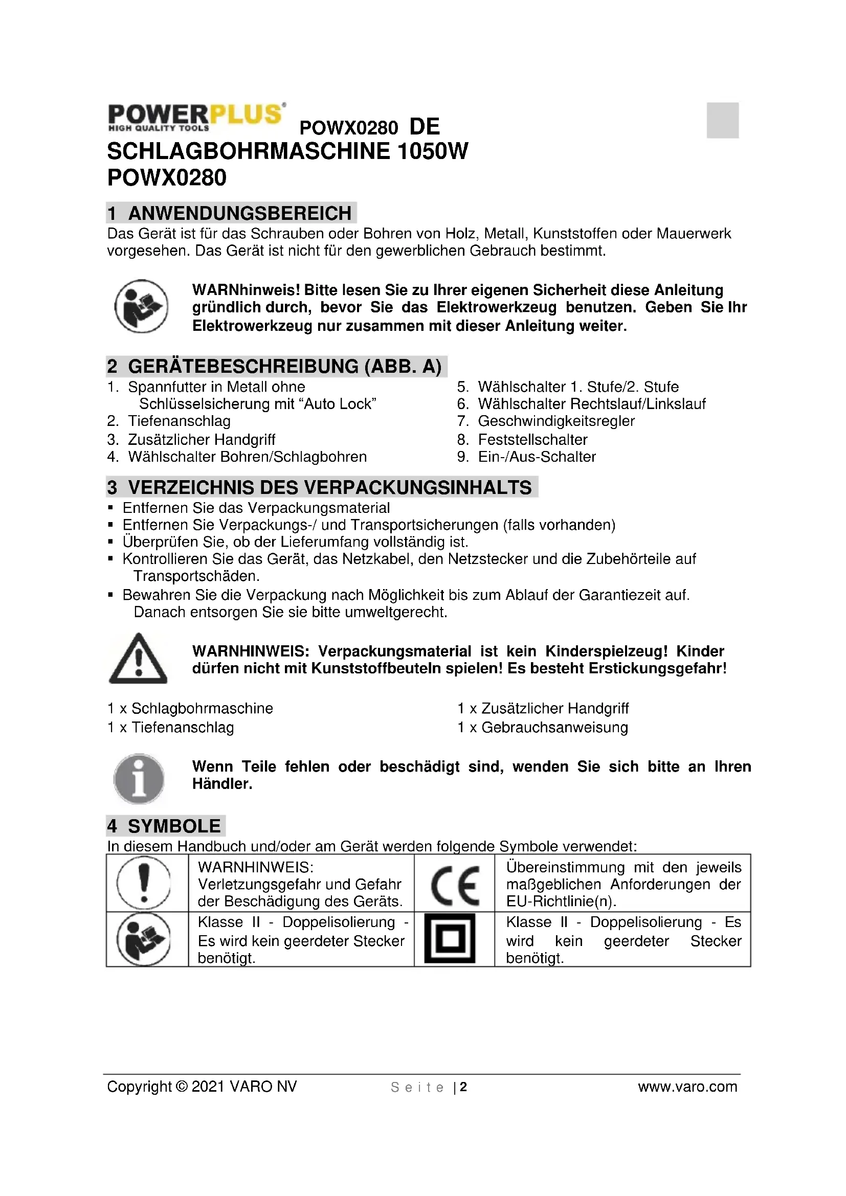 Klasse II - Doppelisolierung - Es wird kein geerdeter Stecker benötigt.POWX0280 DE Copyright © 2021 VARO NV S e i t e | 3 www.varo.com