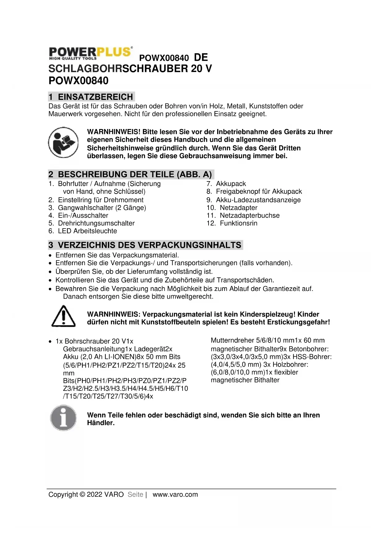Bits(PH0/PH1/PH2/PH3/PZ0/PZ1/PZ2/P Z3/H2/H2.5/H3/H3.5/H4/H4.5/H5/H6/T10 /T15/T20/T25/T27/T30/5/6)4x Mutterndreher 5/6/8/10 mm1x 60 mm magnetischer Bithalter9x Betonbohrer: (3x3,0/3x4,0/3x5,0 mm)3x HSS-Bohrer: (4,0/4,5/5,0 mm) 3x Holzbohrer: (6,0/8,0/10,0 mm)1x flexibler magnetischer Bithalter Wenn Teile fehlen oder beschädigt sind, wenden Sie sich bitte an Ihren Händler.POWX00840 DE Copyright © 2022 VARO Seite | www.varo.com
