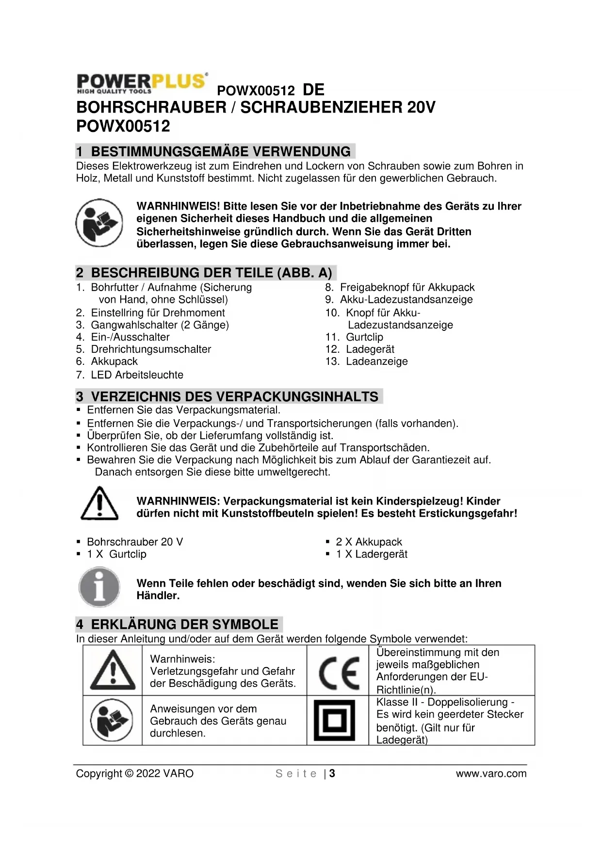 Klasse II - Doppelisolierung - Es wird kein geerdeter Stecker benötigt. (Gilt nur für Ladegerät)POWX00512 DE Copyright © 2022 VARO S e i t e | 4 www.varo.com