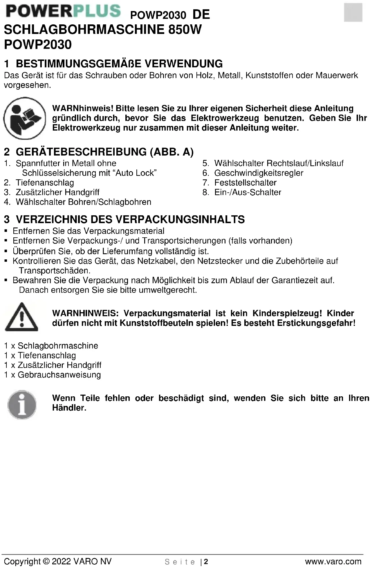 Copyright © 2022 VARO NV S e i t e | 2 www.varo.com SCHLAGBOHRMASCHINE 850W POWP2030 1 BESTIMMUNGSGEMÄßE VERWENDUNG Das Gerät ist für das Schrauben oder Bohren von Holz, Metall, Kunststoffen oder Mauerwerk vorgesehen. WARNhinweis! Bitte lesen Sie zu Ihrer eigenen Sicherheit diese Anleitung gründlich durch, bevor Sie das Elektrowerkzeug benutzen. Geben Sie Ihr Elektrowerkzeug nur zusammen mit dieser Anleitung weiter. 2 GERÄTEBESCHREIBUNG (ABB. A)