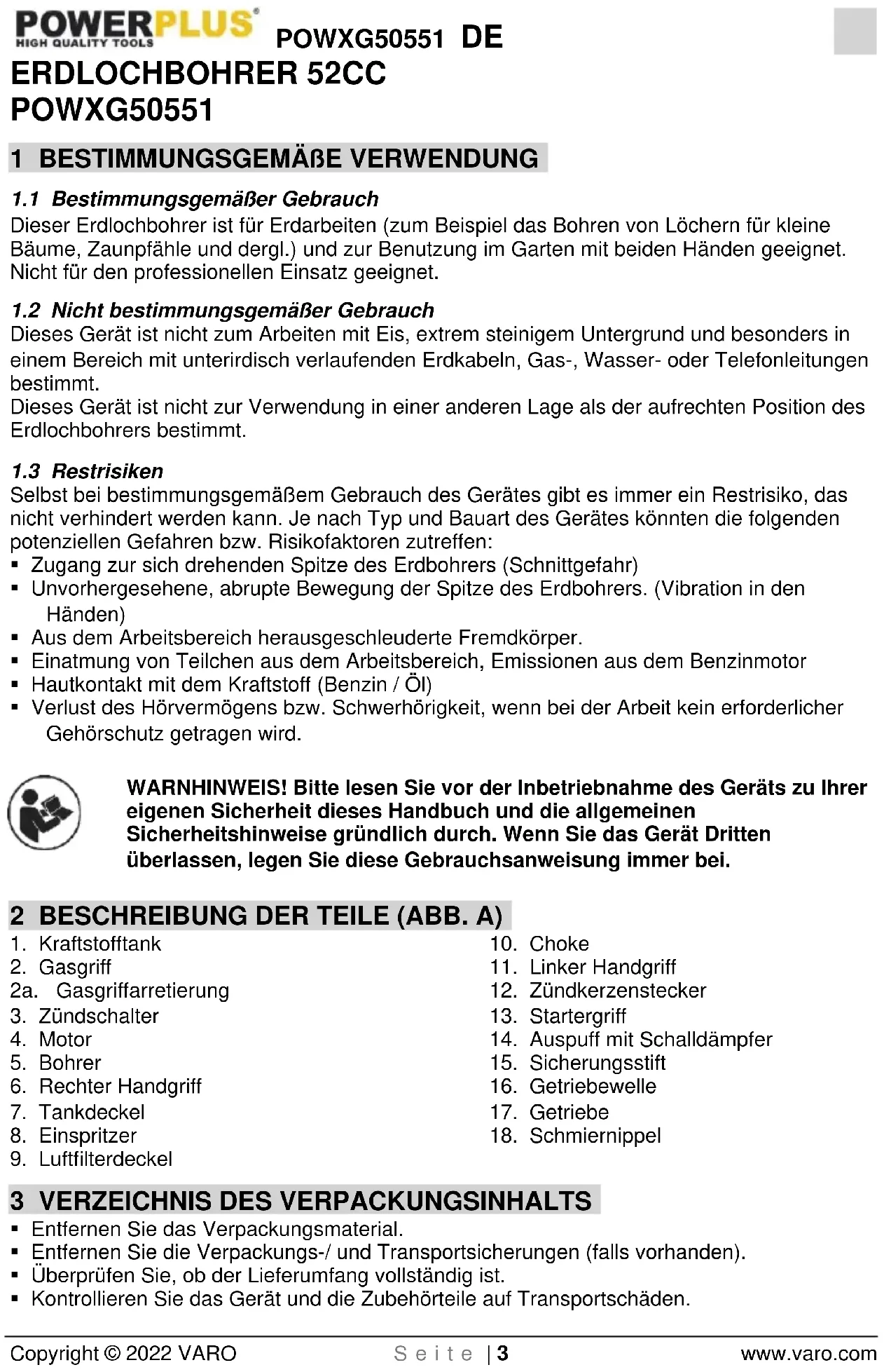 - Vor dem Transport des Geräts in/mit einem Fahrzeug den Motor gut abkühlen lassen, dann den Kraftstofftank leeren, und anschließend das Gerät gut gegen mögliche Bewegung sichern.POWXG50551 DE Copyright © 2022 VARO S e i t e | 6 www.varo.com