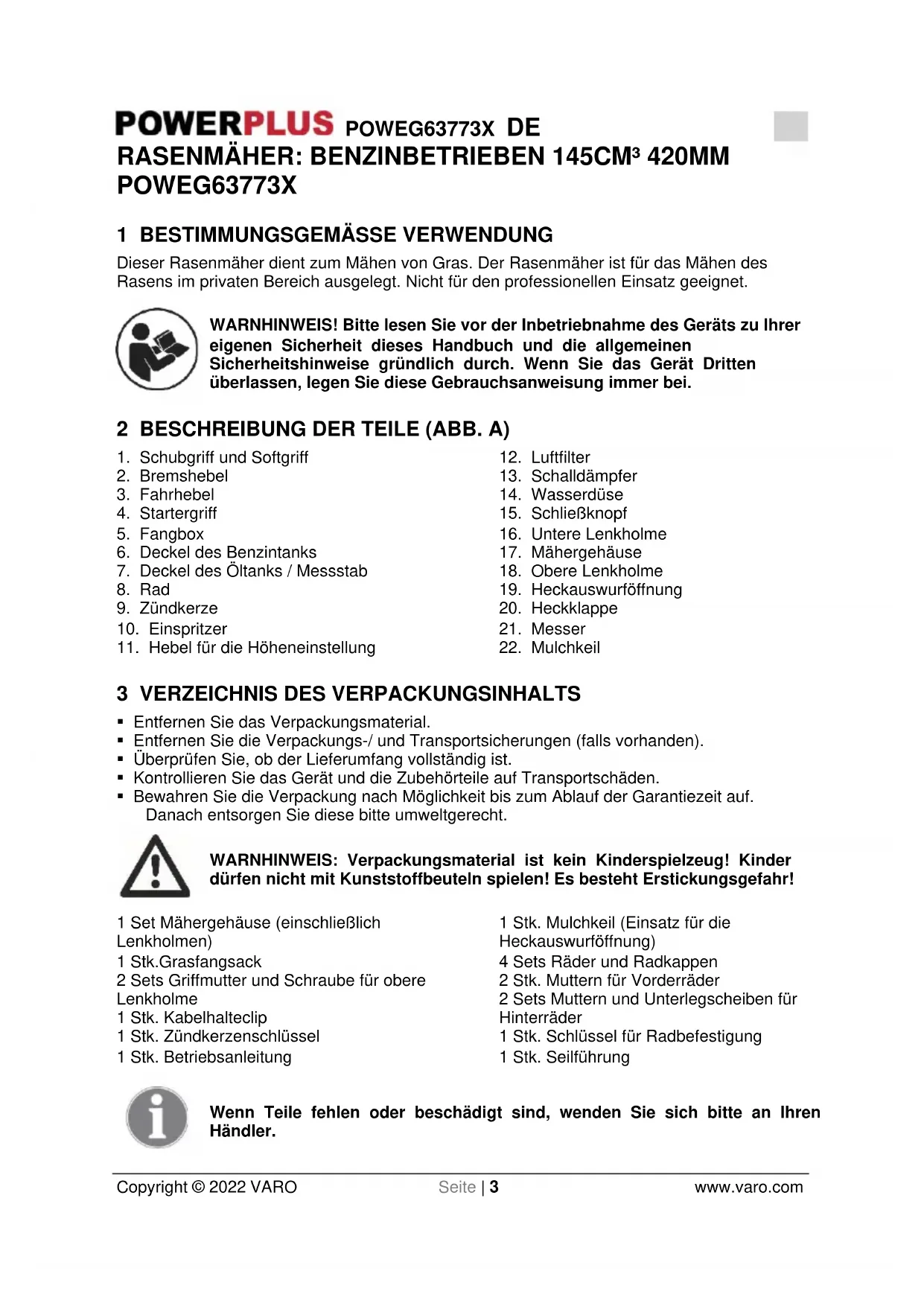 - In folgenden Fällen immer den Motor stoppen und aus Sicherheitsgründen den Zündkerzenstecker abnehmen, abwarten bis alle drehenden Teile zum völligen Stillstand gekommen sind, und, falls vorhanden, den Zündschlüssel abnehmen: − Wenn der Rasenmäher unbeaufsichtigt bleibt;POWEG63773X DE Copyright © 2022 VARO Seite | 8 www.varo.com − Vor dem Betanken;