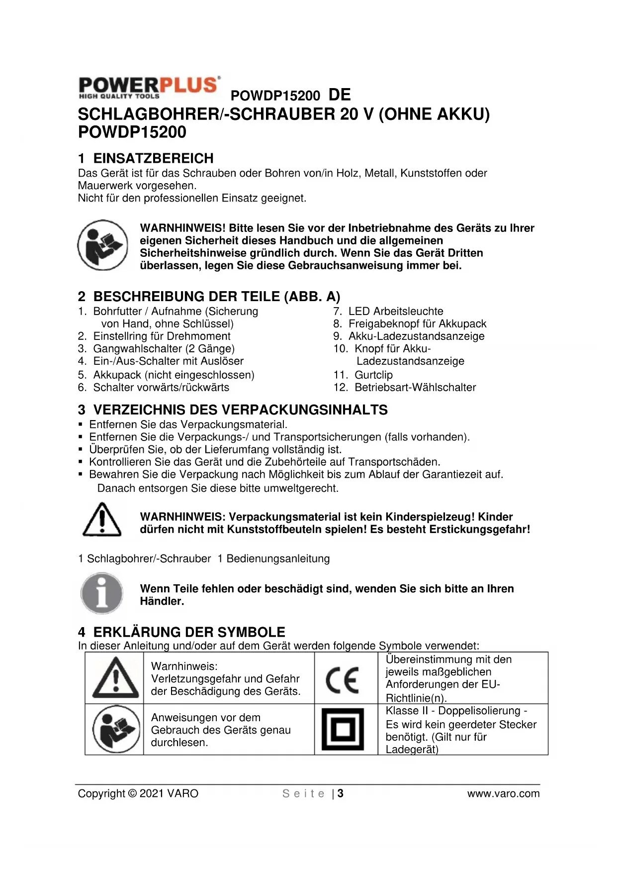 Klasse II - Doppelisolierung - Es wird kein geerdeter Stecker benötigt. (Gilt nur für Ladegerät)POWDP15200 DE Copyright © 2021 VARO S e i t e | 4 www.varo.com