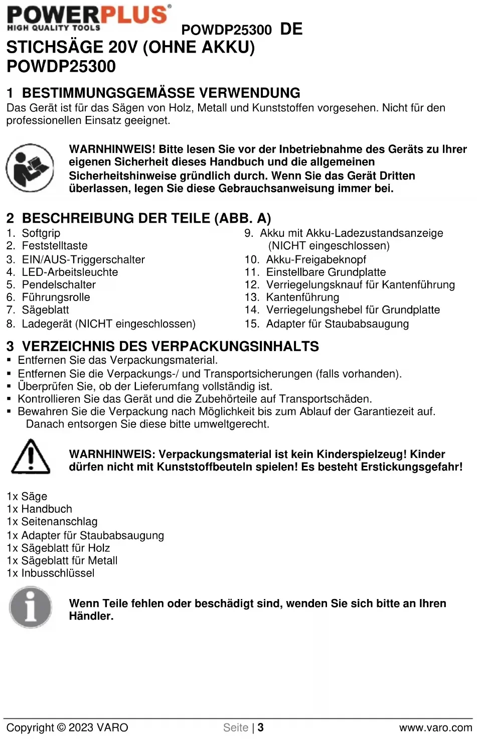 - Bewahren Sie die Verpackung nach Möglichkeit bis zum Ablauf der Garantiezeit auf. Danach entsorgen Sie diese bitte umweltgerecht. WARNHINWEIS: Verpackungsmaterial ist kein Kinderspielzeug! Kinder dürfen nicht mit Kunststoffbeuteln spielen! Es besteht Erstickungsgefahr! 1x Säge 1x Handbuch 1x Seitenanschlag 1x Adapter für Staubabsaugung 1x Sägeblatt für Holz 1x Sägeblatt für Metall 1x Inbusschlüssel Wenn Teile fehlen oder beschädigt sind, wenden Sie sich bitte an Ihren Händler.POWDP25300 DE Copyright © 2023 VARO Seite | 4 www.varo.com
