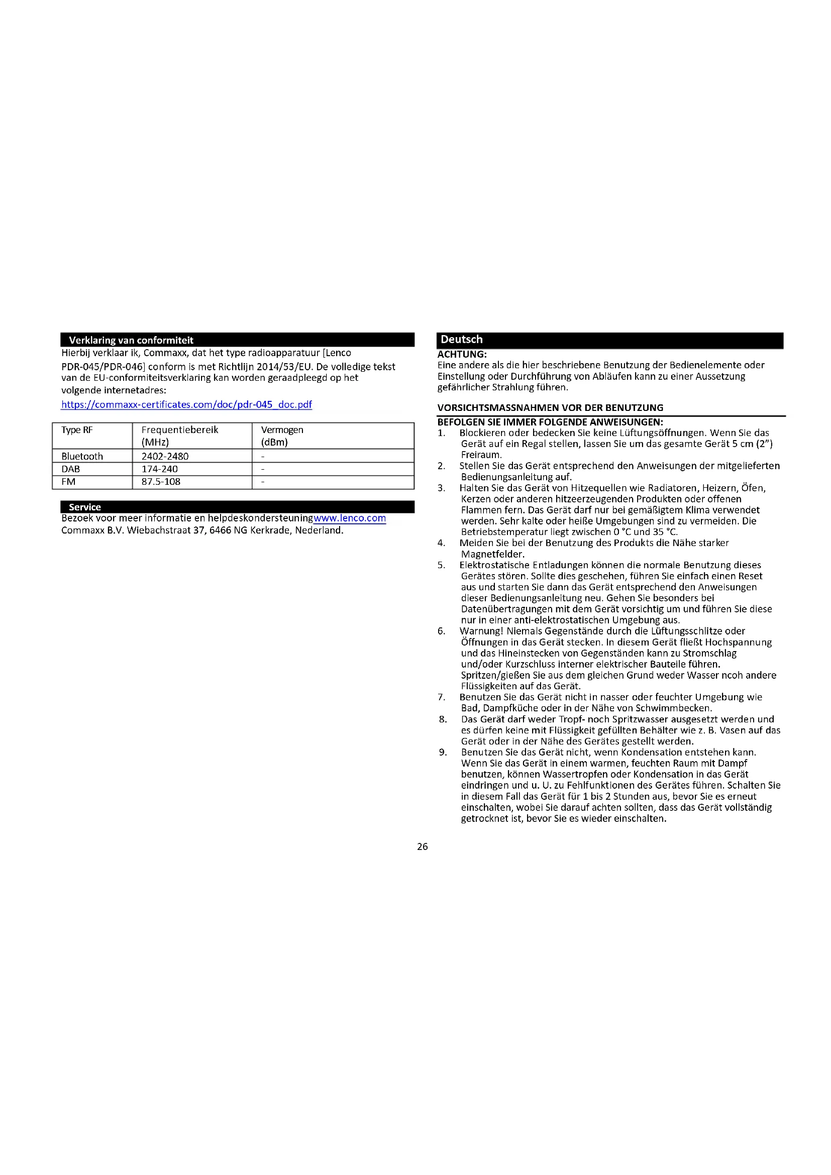 ÜBEREINSTIMMUNGSERKLÄRUNG Hiermit erklärt Commaxx, dass der Funkanlagentyp [Lenco PDR-045/PDR-046] der Richtlinie 2014/53/EU entspricht. Der vollständige Text der EU-Konformitätserklärung ist unter der folgenden Internetadresse verfügbar: https://commaxx-certificates.com/doc/pdr-045_doc.pdf
