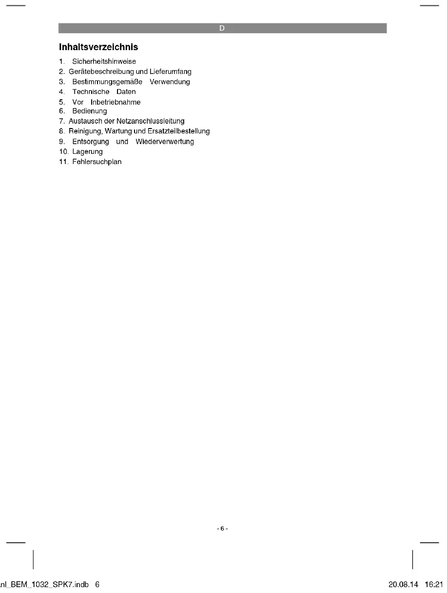Gefahr! - Zur Verringerung des Verletzungsrisikos Bedienungsanleitung lesen Dieses Gerät darf nicht von Kindern benutzt werden. Kinder sollten beaufsichtigt werden, damit sie nicht mit dem Gerät spielen. Reini- gung und Wartung darf nicht von Kindern durchgeführt werden. Das Gerät darf nicht von Personen mit verminderten physischen, senso- rischen oder geistigen Fähigkeiten oder Personen mit unzureichen- dem Wissen oder Erfahrung benutzt werden, außer sie werden von einer für sie verantwortlichen Person beaufsichtigt oder angeleitet. Wenn die Netzanschlussleitung dieses Gerätes beschädigt wird, muss sie durch den Hersteller oder seinen Kundendienst oder eine ähnlich qualifi zierte Person ersetzt werden, um Gefährdungen zu vermeiden. Anl_BEM_1032_SPK7.indb 7Anl_BEM_1032_SPK7.indb 7 20.08.14 16:2120.08.14 16:21D