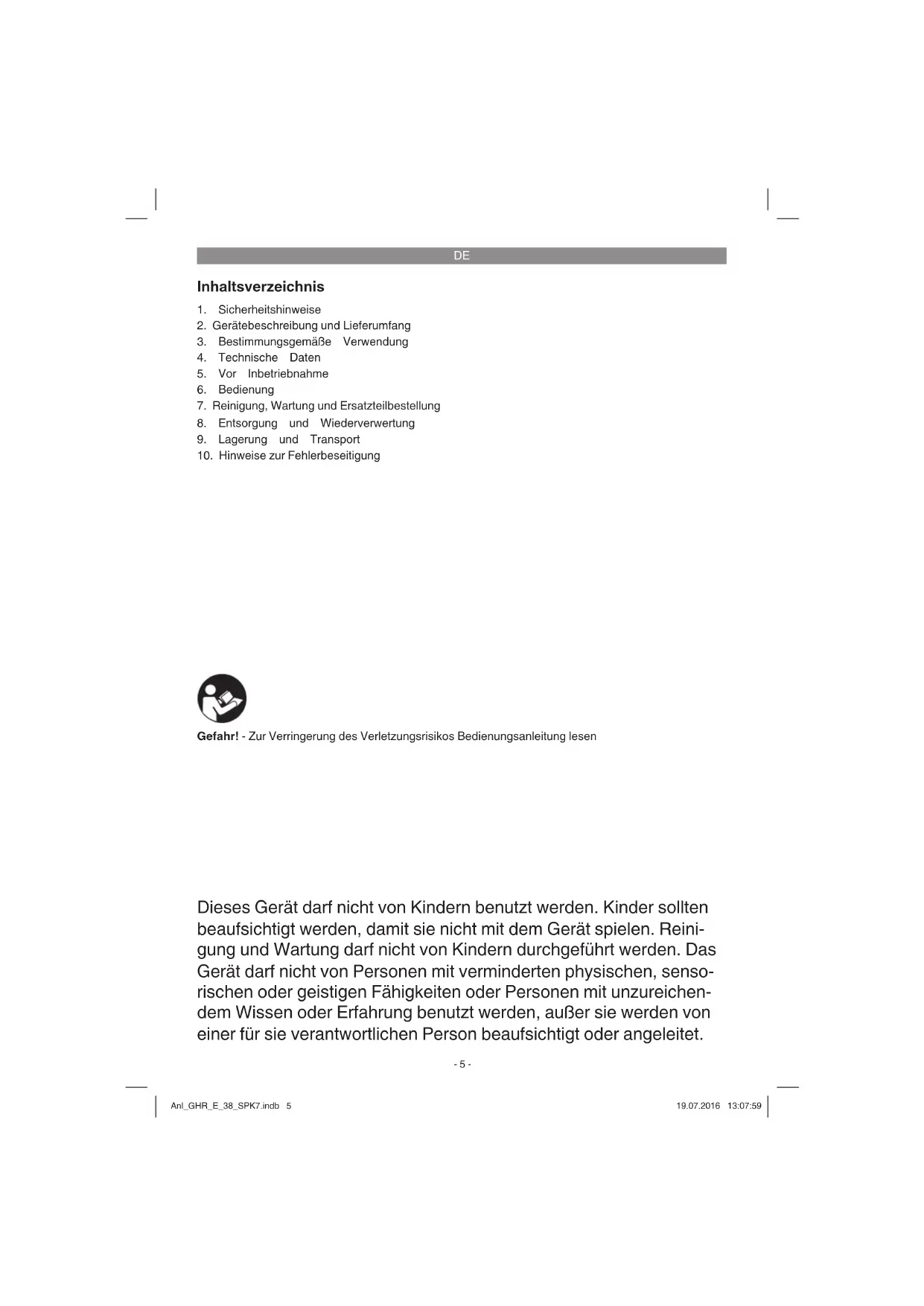 Dieses Gerät darf nicht von Kindern benutzt werden. Kinder sollten beaufsichtigt werden, damit sie nicht mit dem Gerät spielen. Reini- gung und Wartung darf nicht von Kindern durchgeführt werden. Das Gerät darf nicht von Personen mit verminderten physischen, senso- rischen oder geistigen Fähigkeiten oder Personen mit unzureichen- dem Wissen oder Erfahrung benutzt werden, außer sie werden von einer für sie verantwortlichen Person beaufsichtigt oder angeleitet. Gefahr! - Zur Verringerung des Verletzungsrisikos Bedienungsanleitung lesen Anl_GHR_E_38_SPK7.indb 5Anl_GHR_E_38_SPK7.indb 5 19.07.2016 13:07:5919.07.2016 13:07:59DE