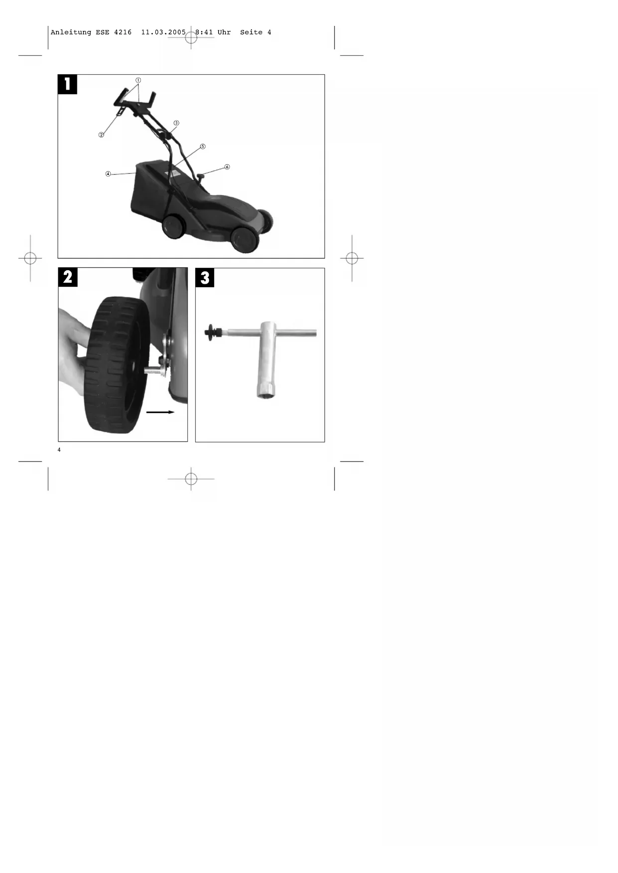 Anleitung ESE 4216 11.03.2005 8:41 Uhr Seite 11befestigen Sie das Rad (Bild 4). Haben Sie das Rad befestigt, müssen Sie noch die Radkappe aufsetzen (Bild 5). Bei den restlichen 3 Rädern gehen Sie bitte genau so vor. Montage des Verstellknopfes für die Zentral- höhenverstellung (siehe Bilder 6 und 7) Als Transportschutz wurde auf das Vierkanteisen der Zentralhöhenverstellung eine Schutzkappe aufgesetzt. Für den späteren Gebrauch ist diese nicht erforderlich. Nehmen Sie den beiliegenden Verstellknopf und setzen Sie ihn auf das Vierkanteisen (Bild 6). Mit der beiliegenden Schraube kann der Verstellknopf befestigt werden (Bild 6). Anschließend stecken Sie das Oberteil des Verstellknopfes auf das Unterteil (Bild 7). Montage des Schubbügels (siehe Bilder 8 bis 14) Nehmen Sie den unteren Schubbügel und schieben Sie ihn auf die bereits vormontierten Halterohre (Bild 8). Befestigen Sie den unteren Schubbügel, wie in Bild 9 gezeigt, mit den beiliegenden Hutmuttern. Der obere Schaltbügel muss auf den unteren Schub- bügel geschoben werden (Bild 11). Mit den beliegen- den Schrauben (1) und Handrädern (2) kann der obere Schubbügel befestigt werden (Bild 12). Mit den beiliegenden Kabelhalterungs-Klipsen (Bild 13) kann das Kabel am Schubbügel befestigt werden (Bild 14). Montage der Kabelzugentlastung (siehe Bild 10) Die Kabelzugentlastung muss auf das obere Hand- griffteil aufgesteckt werden, bis sie einrastet. Sie kann sowohl wie auf dem Bild 10 als auch auf der gegenüberliegenden Seite montiert werden. Montage der Grasfangeinrichtung (siehe Bilder 15 bis 17) Stülpen Sie den Grasfangsack über das Bügelgestell (Bild 15). Der Grasfangsack muss wie in Bild 16 und 17 gezeigt am Bügelgestell befestigt werden. Zum Einhängen des Fangsackes muss der Motor abgeschaltet werden und das Schneidemesser darf sich nicht drehen. Auswurfklappe (Bild 1 / Pos. 5) mit einer Hand anheben. Mit der anderen Hand den Fangsack am Handgriff halten und von oben einhängen (Bild 18).