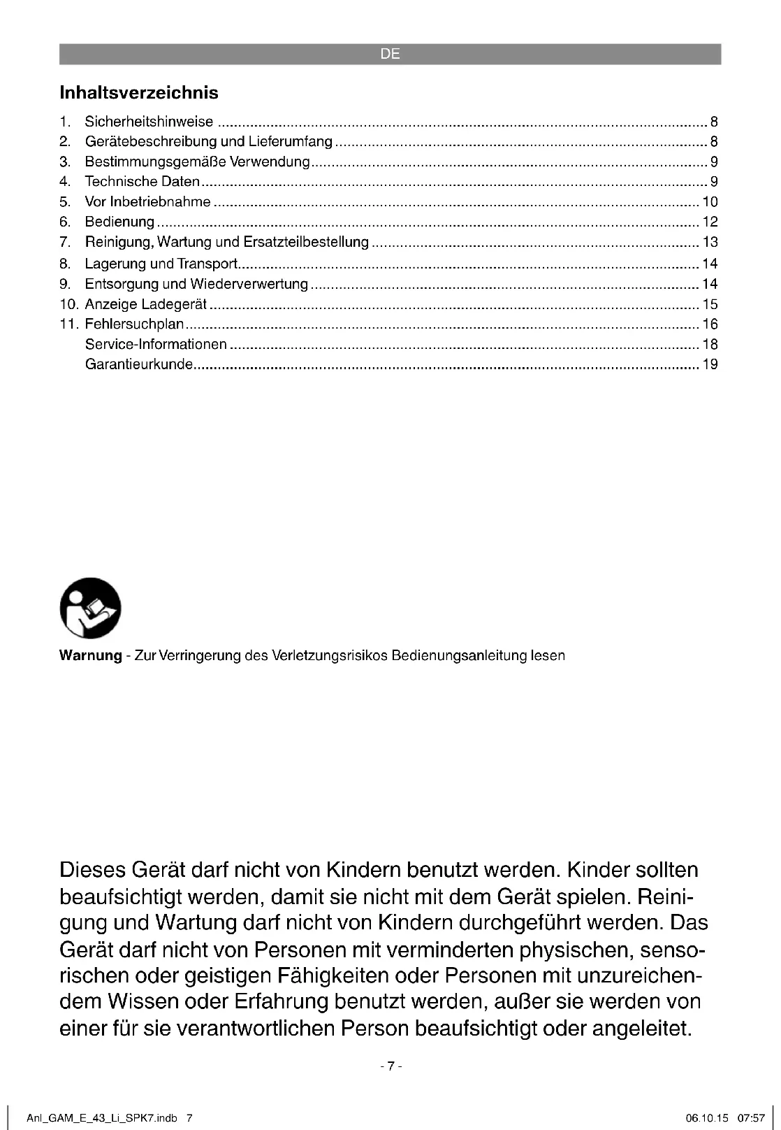 - Garantieurkunde Warnung - Zur Verringerung des Verletzungsrisikos Bedienungsanleitung lesen Anl_GAM_E_43_Li_SPK7.indb 7Anl_GAM_E_43_Li_SPK7.indb 7 06.10.15 07:5706.10.15 07:57DE p. 19