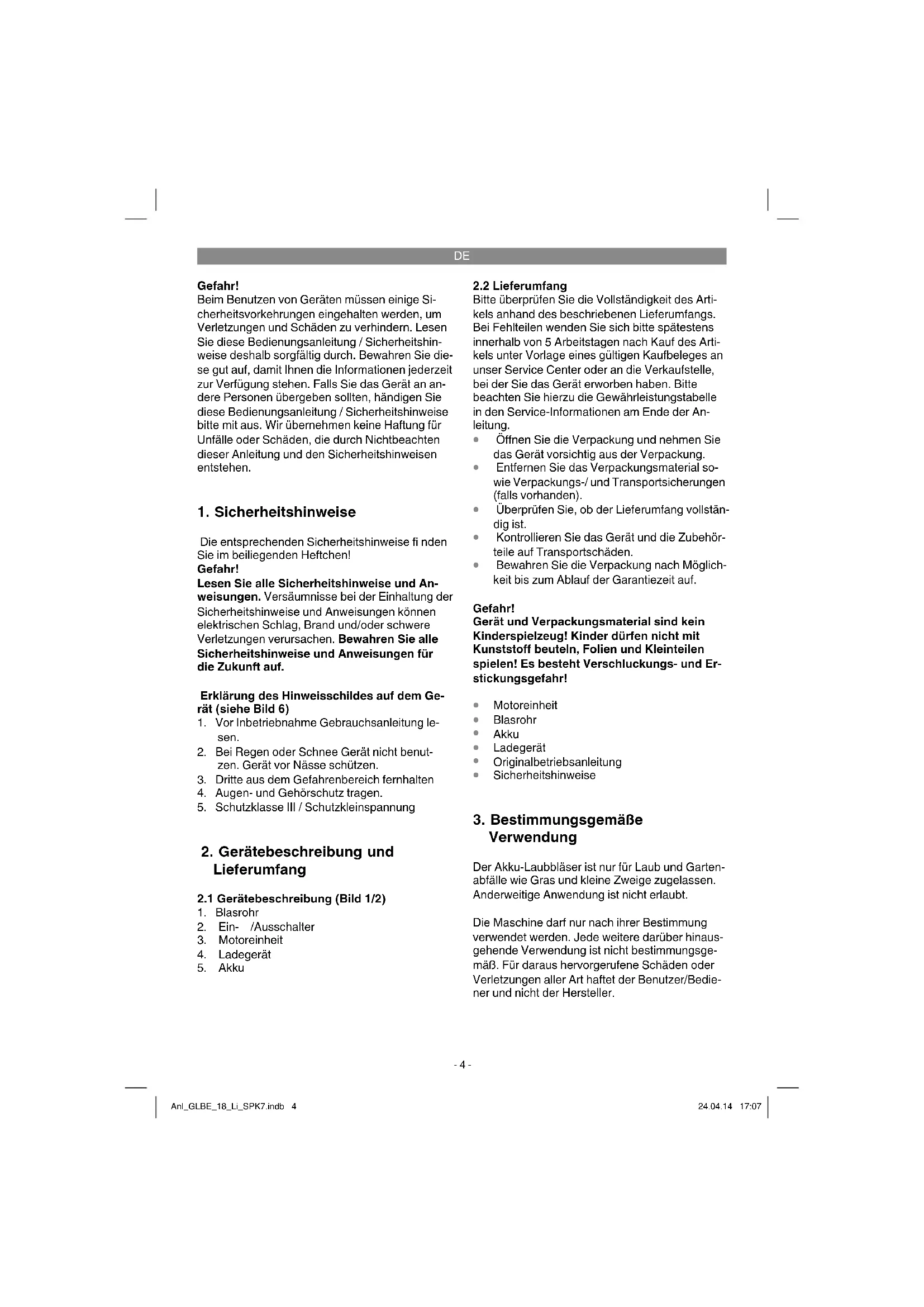 Verwendung Der Akku-Laubbläser ist nur für Laub und Garten- abfälle wie Gras und kleine Zweige zugelassen. Anderweitige Anwendung ist nicht erlaubt. Die Maschine darf nur nach ihrer Bestimmung verwendet werden. Jede weitere darüber hinaus- gehende Verwendung ist nicht bestimmungsge- mäß. Für daraus hervorgerufene Schäden oder Verletzungen aller Art haftet der Benutzer/Bedie- ner und nicht der Hersteller. Anl_GLBE_18_Li_SPK7.indb 4Anl_GLBE_18_Li_SPK7.indb 4 24.04.14 17:0724.04.14 17:07DE