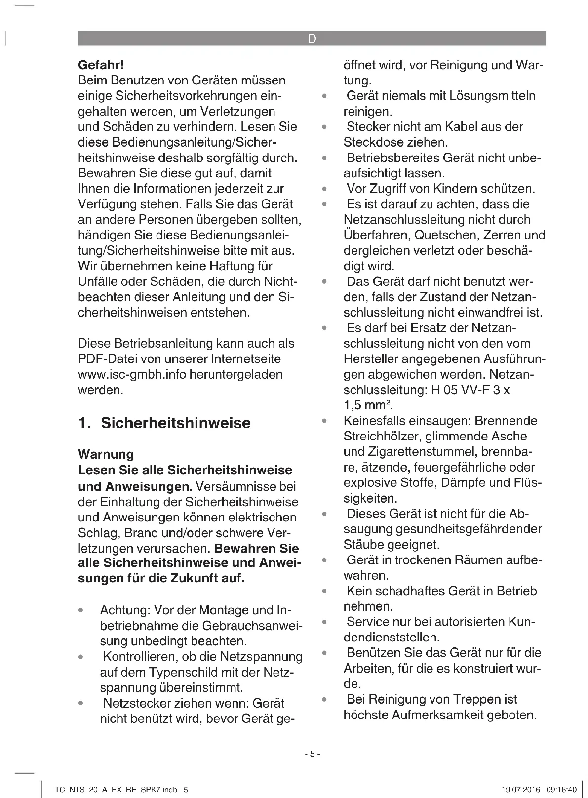 Gefahr! Beim Benutzen von Geräten müssen einige Sicherheitsvorkehrungen ein- gehalten werden, um Verletzungen und Schäden zu verhindern. Lesen Sie diese Bedienungsanleitung/Sicher- heitshinweise deshalb sorgfältig durch. Bewahren Sie diese gut auf, damit Ihnen die Informationen jederzeit zur Verfügung stehen. Falls Sie das Gerät an andere Personen übergeben sollten, händigen Sie diese Bedienungsanlei- tung/Sicherheitshinweise bitte mit aus. Wir übernehmen keine Haftung für Unfälle oder Schäden, die durch Nicht- beachten dieser Anleitung und den Si- cherheitshinweisen entstehen. Diese Betriebsanleitung kann auch als PDF-Datei von unserer Internetseite www.isc-gmbh.info heruntergeladen werden.