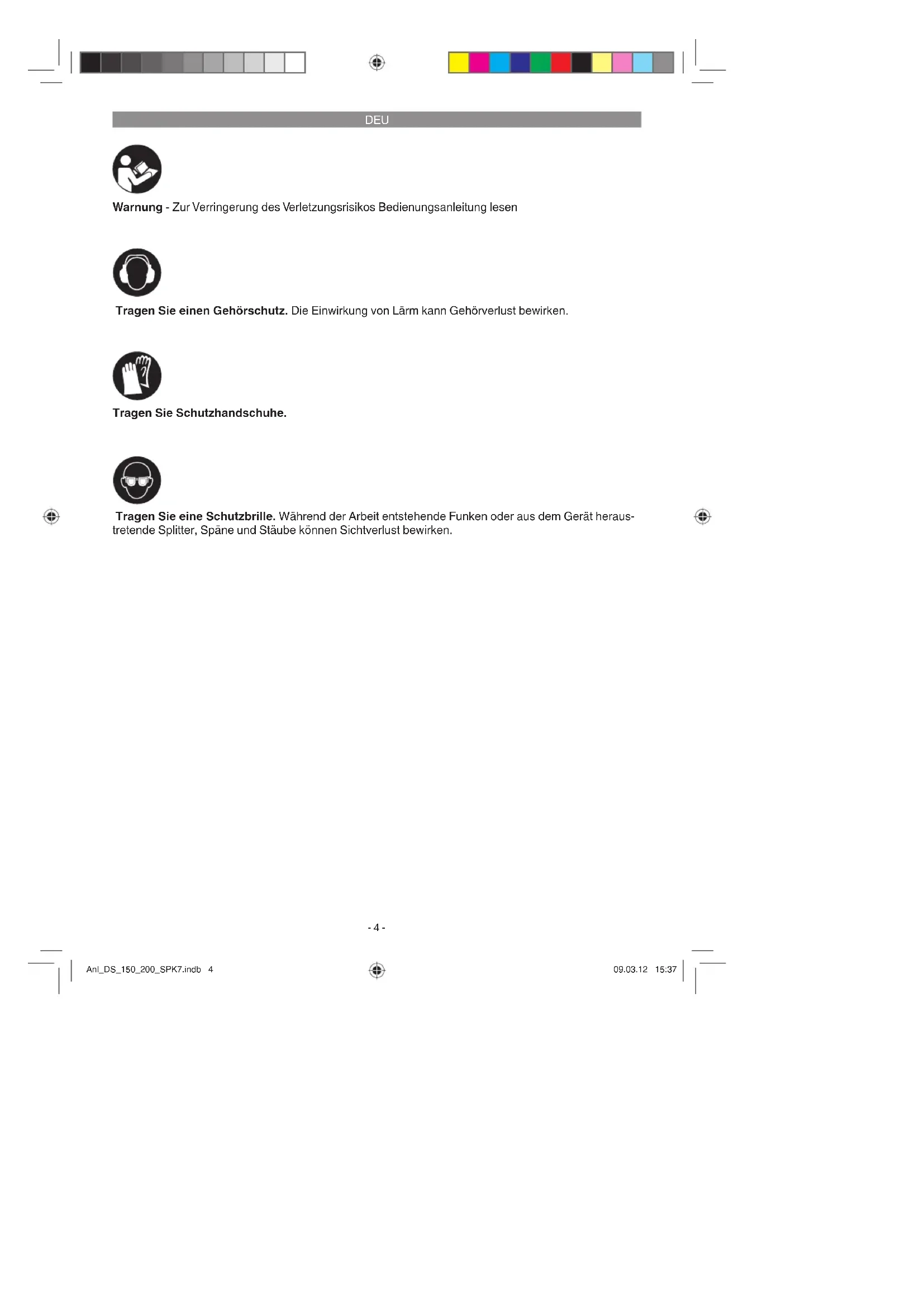 Warnung - Zur Verringerung des Verletzungsrisikos Bedienungsanleitung lesen Tragen Sie einen Gehörschutz. Die Einwirkung von Lärm kann Gehörverlust bewirken. Tragen Sie eine Schutzbrille. Während der Arbeit entstehende Funken oder aus dem Gerät heraus- tretende Splitter, Späne und Stäube können Sichtverlust bewirken. Tragen Sie Schutzhandschuhe. Anl_DS_150_200_SPK7.indb 4Anl_DS_150_200_SPK7.indb 4 09.03.12 15:3709.03.12 15:37DEU