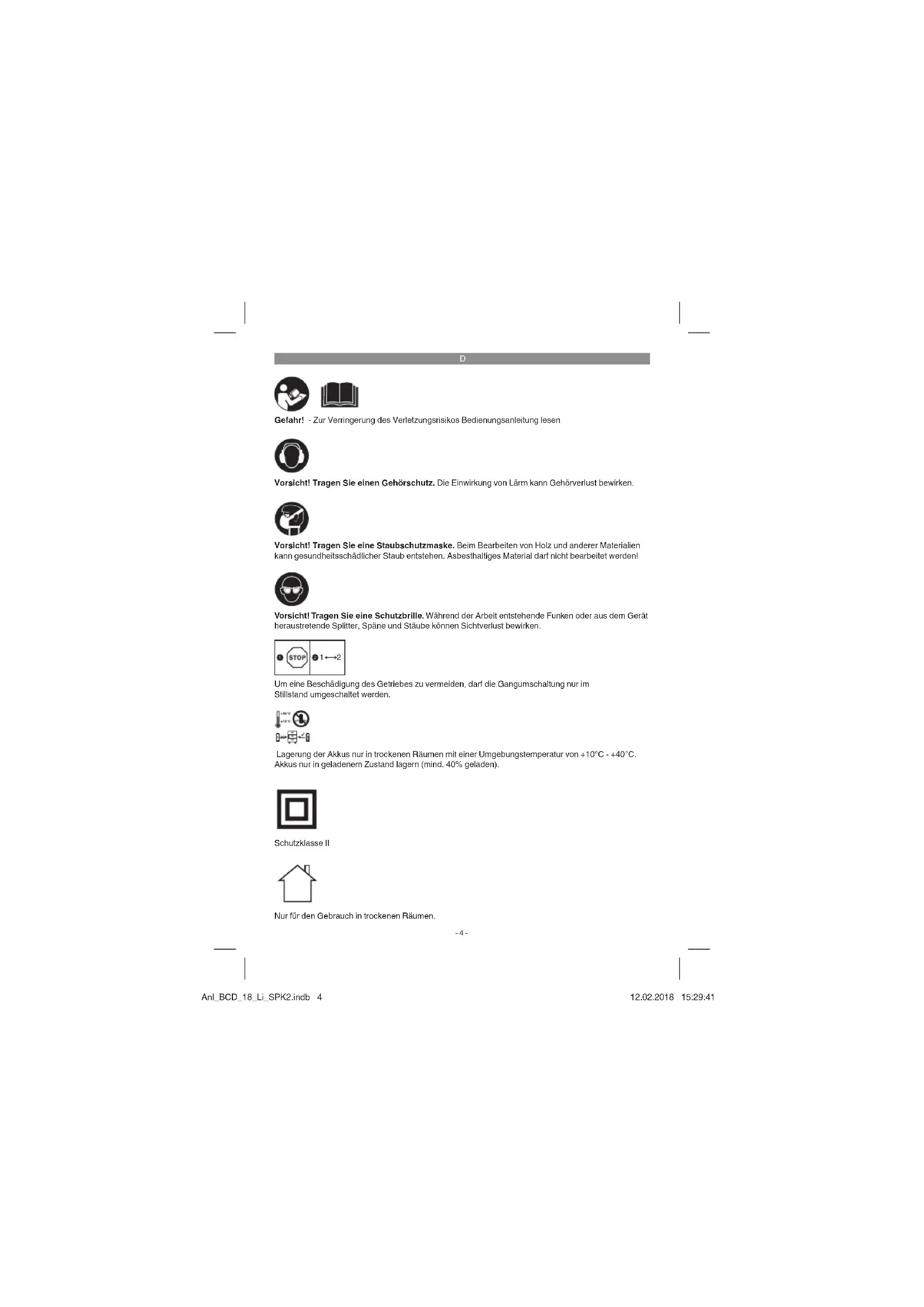 Verwendung Der Akku-Bohrschrauber ist geeignet zum Ein- drehen und Lösen von Schrauben in Holz, sowie zum Bohren in Holz, Metall und Kunststoff . Die Maschine darf nur nach ihrer Bestimmung verwendet werden. Jede weitere darüber hinaus- gehende Verwendung ist nicht bestimmungsge- mäß. Für daraus hervorgerufene Schäden oder Verletzungen aller Art haftet der Benutzer/Bedie- ner und nicht der Hersteller. Anl_BCD_18_Li_SPK2.indb 5Anl_BCD_18_Li_SPK2.indb 5 12.02.2018 15:29:4212.02.2018 15:29:42D