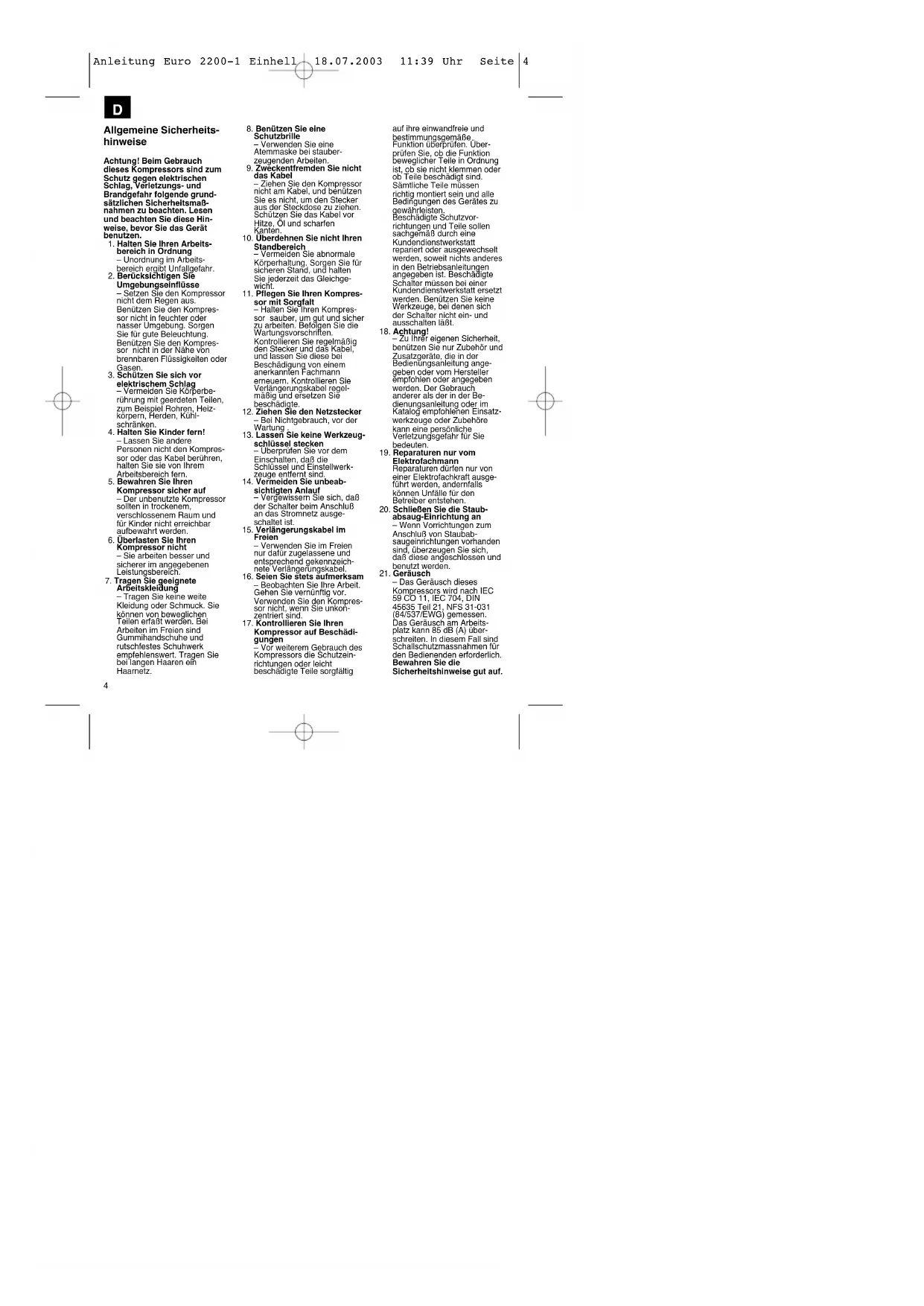 Anleitung Euro 2200-1 Einhell 18.07.2003 11:39 Uhr Seite 4Vor Inbetriebnahme lesen Sie bitte die Anleitung sorgfältig durch! Technische Daten EURO 2200-1 Netzanschluß 230 V ~ 50 Hz Motorleistung kW/PS 1,5 / 2 Kompressor-Drehzahl min