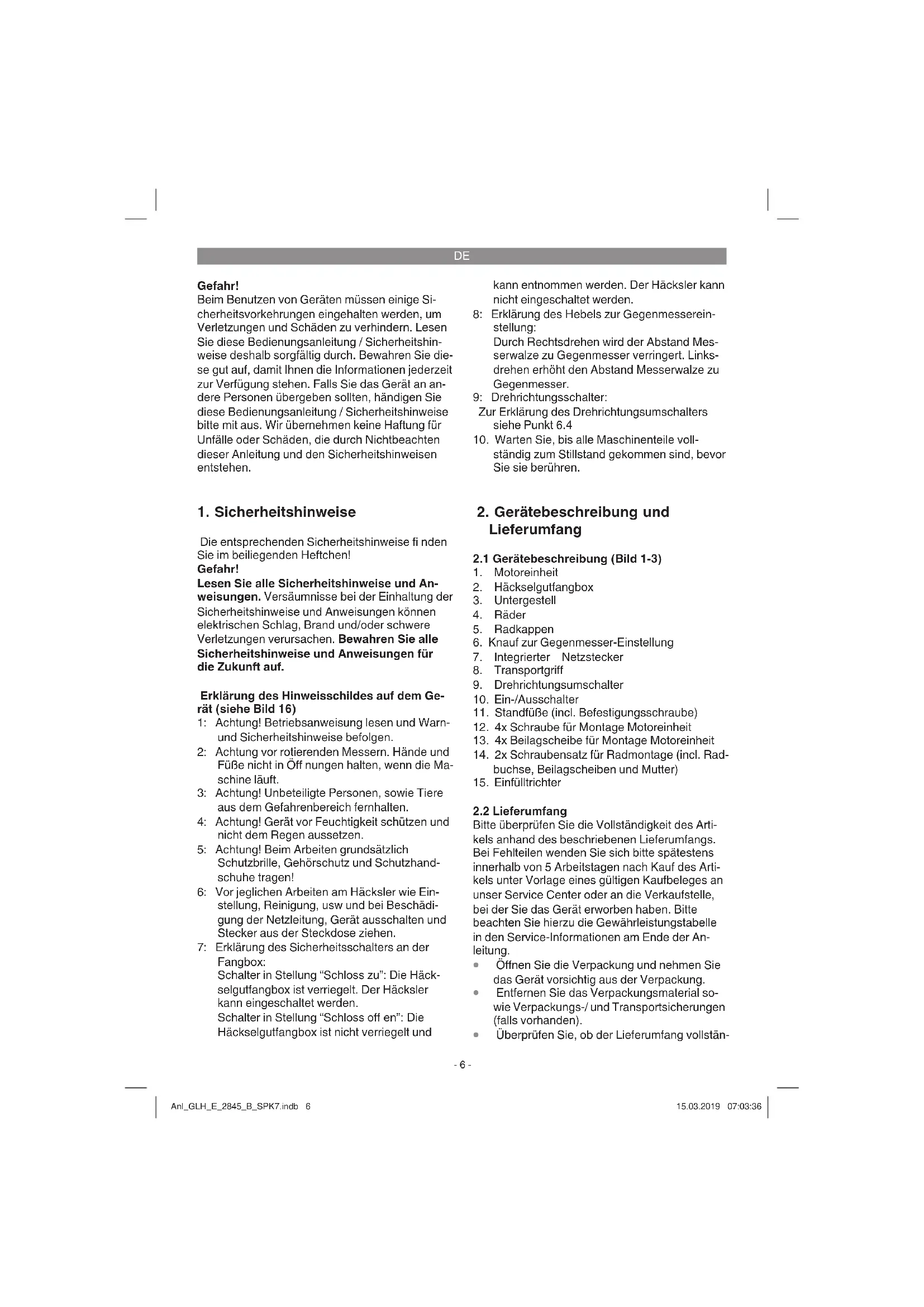 Die entsprechenden Sicherheitshinweise fi nden Sie im beiliegenden Heftchen! Gefahr! Lesen Sie alle Sicherheitshinweise und An- weisungen. Versäumnisse bei der Einhaltung der Sicherheitshinweise und Anweisungen können elektrischen Schlag, Brand und/oder schwere Verletzungen verursachen. Bewahren Sie alle Sicherheitshinweise und Anweisungen für die Zukunft auf. Erklärung des Hinweisschildes auf dem Ge- rät (siehe Bild 16) 1: Achtung! Betriebsanweisung lesen und Warn- und Sicherheitshinweise befolgen. 2: Achtung vor rotierenden Messern. Hände und Füße nicht in Öff nungen halten, wenn die Ma- schine läuft. 3: Achtung! Unbeteiligte Personen, sowie Tiere aus dem Gefahrenbereich fernhalten. 4: Achtung! Gerät vor Feuchtigkeit schützen und nicht dem Regen aussetzen. 5: Achtung! Beim Arbeiten grundsätzlich Schutzbrille, Gehörschutz und Schutzhand- schuhe tragen! 6: Vor jeglichen Arbeiten am Häcksler wie Ein- stellung, Reinigung, usw und bei Beschädi- gung der Netzleitung, Gerät ausschalten und Stecker aus der Steckdose ziehen. 7: Erklärung des Sicherheitsschalters an der Fangbox: Schalter in Stellung “Schloss zu”: Die Häck- selgutfangbox ist verriegelt. Der Häcksler kann eingeschaltet werden. Schalter in Stellung “Schloss off en”: Die Häckselgutfangbox ist nicht verriegelt und kann entnommen werden. Der Häcksler kann nicht eingeschaltet werden. 8: Erklärung des Hebels zur Gegenmesserein- stellung: Durch Rechtsdrehen wird der Abstand Mes- serwalze zu Gegenmesser verringert. Links- drehen erhöht den Abstand Messerwalze zu Gegenmesser. 9: Drehrichtungsschalter: Zur Erklärung des Drehrichtungsumschalters siehe Punkt 6.4