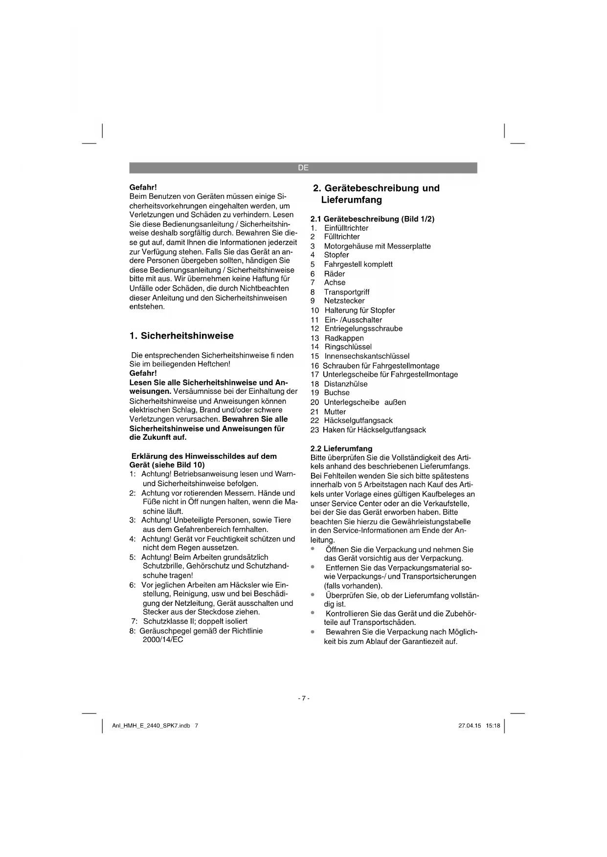 Die entsprechenden Sicherheitshinweise fi nden Sie im beiliegenden Heftchen! Gefahr! Lesen Sie alle Sicherheitshinweise und An- weisungen. Versäumnisse bei der Einhaltung der Sicherheitshinweise und Anweisungen können elektrischen Schlag, Brand und/oder schwere Verletzungen verursachen. Bewahren Sie alle Sicherheitshinweise und Anweisungen für die Zukunft auf. Erklärung des Hinweisschildes auf dem Gerät (siehe Bild 10) 1: Achtung! Betriebsanweisung lesen und Warn- und Sicherheitshinweise befolgen. 2: Achtung vor rotierenden Messern. Hände und Füße nicht in Öff nungen halten, wenn die Ma- schine läuft. 3: Achtung! Unbeteiligte Personen, sowie Tiere aus dem Gefahrenbereich fernhalten. 4: Achtung! Gerät vor Feuchtigkeit schützen und nicht dem Regen aussetzen. 5: Achtung! Beim Arbeiten grundsätzlich Schutzbrille, Gehörschutz und Schutzhand- schuhe tragen! 6: Vor jeglichen Arbeiten am Häcksler wie Ein- stellung, Reinigung, usw und bei Beschädi- gung der Netzleitung, Gerät ausschalten und Stecker aus der Steckdose ziehen. 7: Schutzklasse II; doppelt isoliert 8: Geräuschpegel gemäß der Richtlinie 2000/14/EC