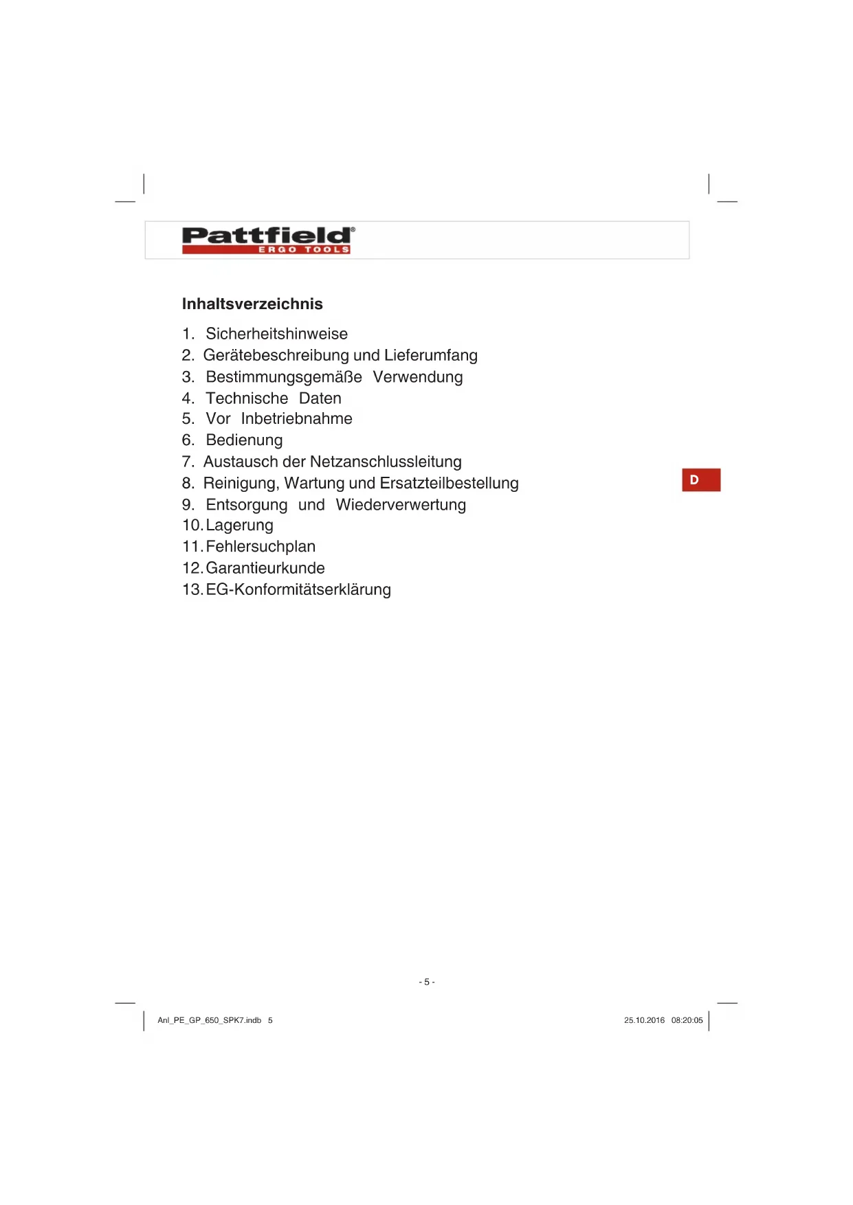 Finden Sie kostenlos die Bedienungsanleitung des Geräts PE-GP 650 Pattfield als PDF.