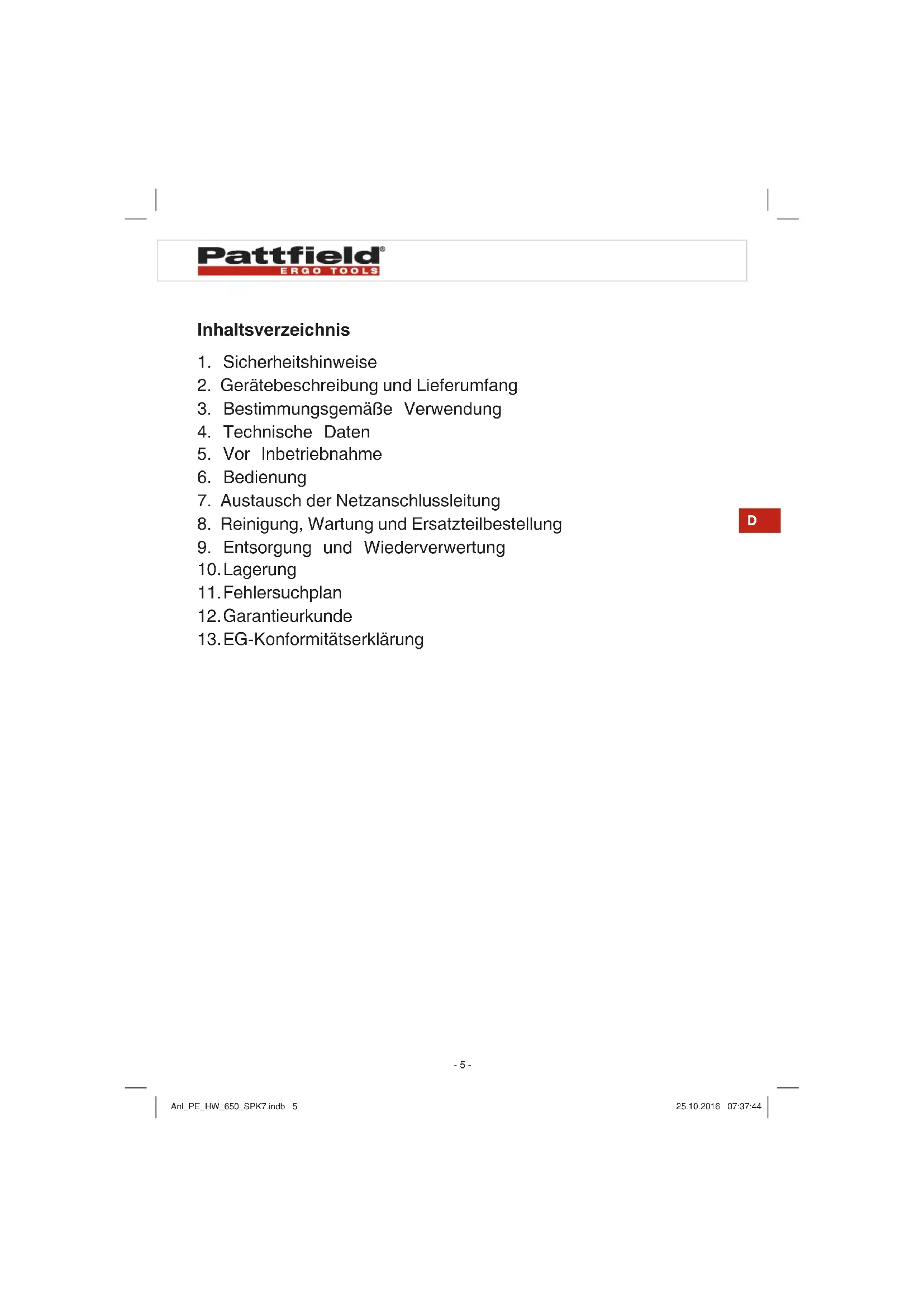 BEDIENUNGSANLEITUNG PE-HW 650 Pattfield