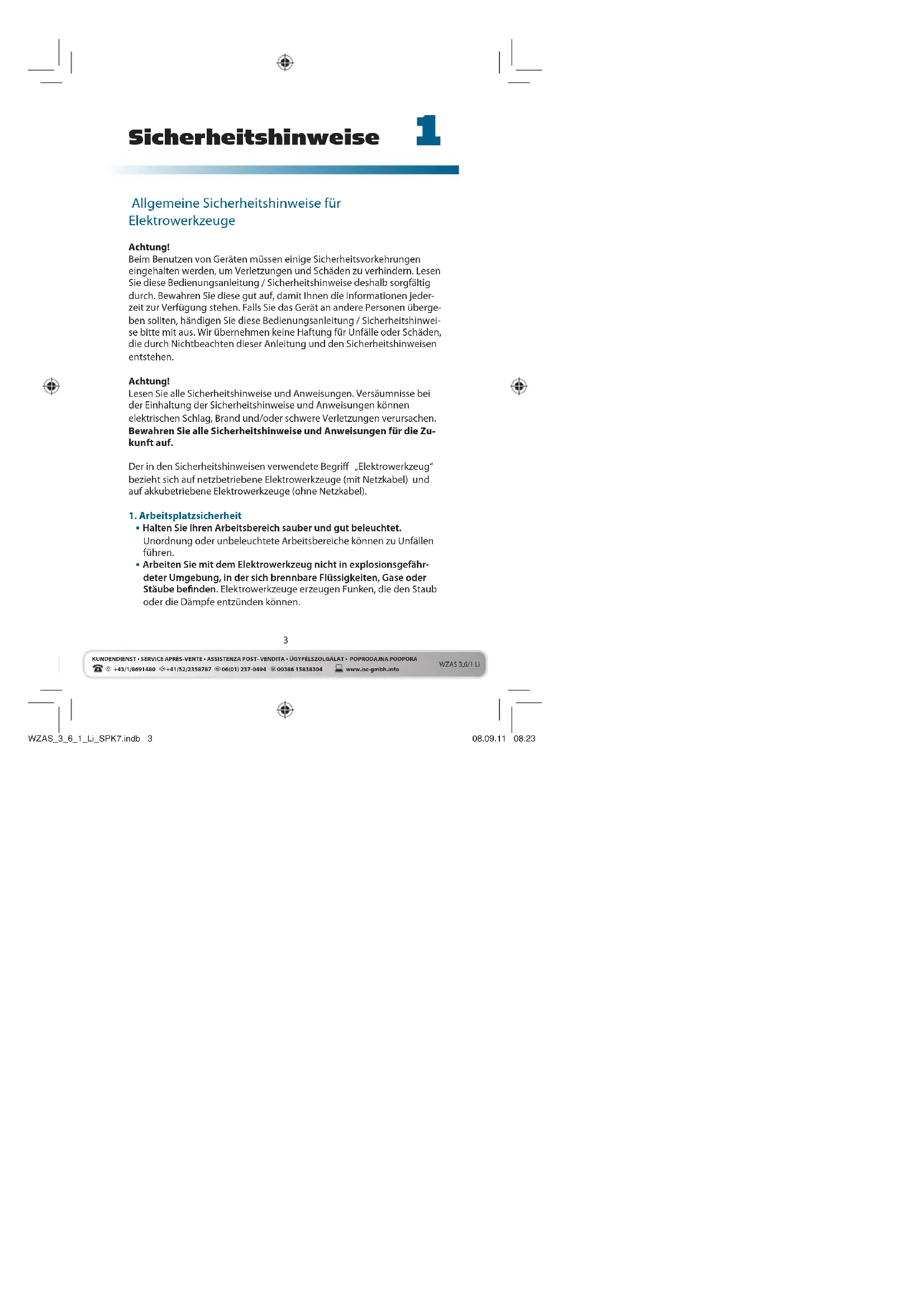 +43/1/8691480 +41/52/2358787 06(01) 237-0494 00386 15838304KUNDENDIENST • SERVICE APRÈS-VENTE • ASSISTENZA POST- VENDITA • ÜGYFÉLSZOLGÁLAT • POPRODAJNA PODPORAwww.isc-gmbh.infoWZAS 3,6/1 Li Allgemeine Sicherheitshinweise für Elektrowerkzeuge Achtung! Beim Benutzen von Geräten müssen einige Sicherheitsvorkehrungen eingehalten werden, um Verletzungen und Schäden zu verhindern. Lesen Sie diese Bedienungsanleitung / Sicherheitshinweise deshalb sorgfältig durch. Bewahren Sie diese gut auf, damit Ihnen die Informationen jeder- zeit zur Verfügung stehen. Falls Sie das Gerät an andere Personen überge- ben sollten, händigen Sie diese Bedienungsanleitung / Sicherheitshinwei- se bitte mit aus. Wir übernehmen keine Haftung für Unfälle oder Schäden, die durch Nichtbeachten dieser Anleitung und den Sicherheitshinweisen entstehen. Achtung! Lesen Sie alle Sicherheitshinweise und Anweisungen. Versäumnisse bei der Einhaltung der Sicherheitshinweise und Anweisungen können elektrischen Schlag, Brand und/oder schwere Verletzungen verursachen. Bewahren Sie alle Sicherheitshinweise und Anweisungen für die Zu- kunft auf. Der in den Sicherheitshinweisen verwendete Begriff „Elektrowerkzeug“ bezieht sich auf netzbetriebene Elektrowerkzeuge (mit Netzkabel) und auf akkubetriebene Elektrowerkzeuge (ohne Netzkabel).