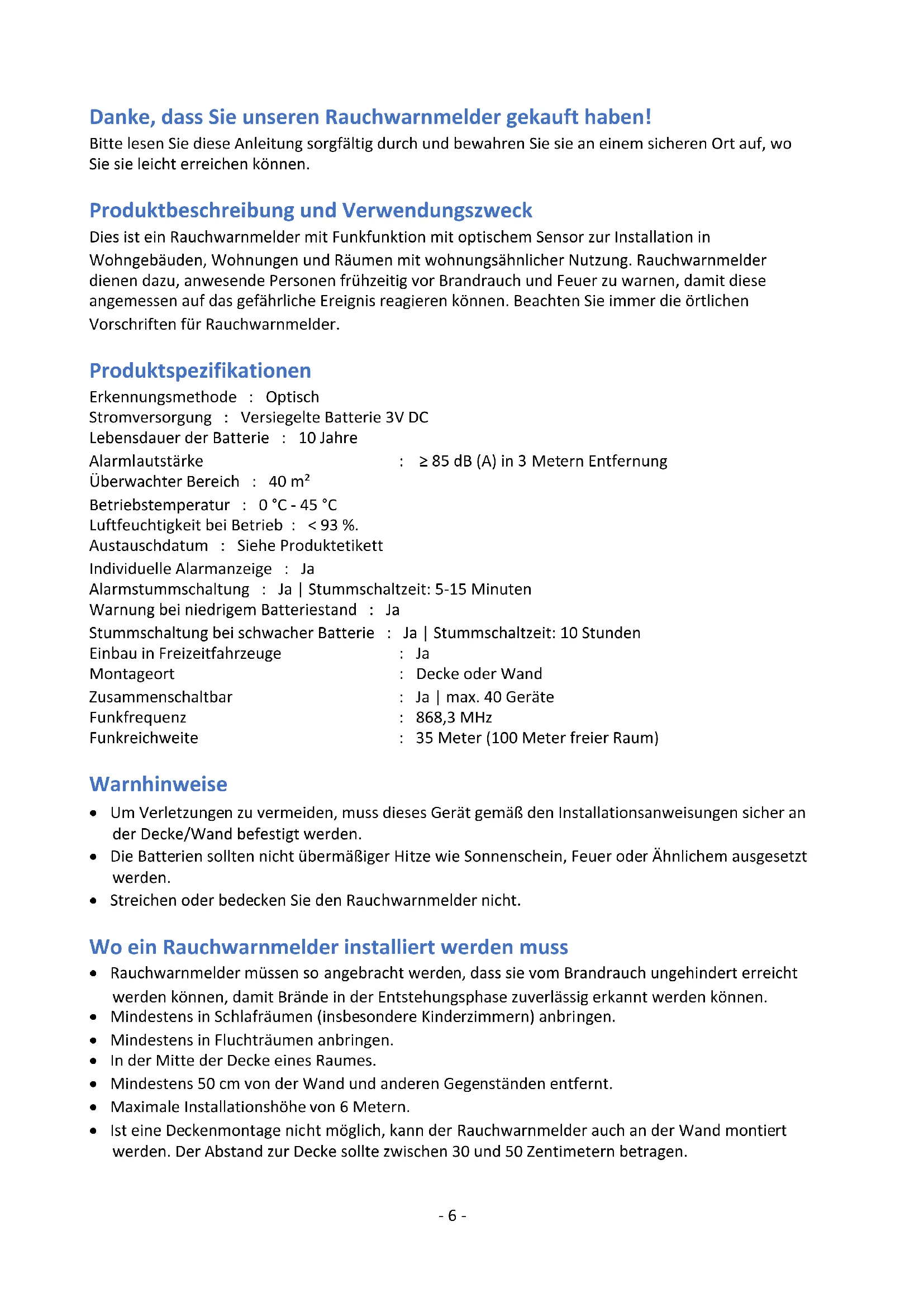 DoP: FZ5010R-01 22 FZ5010R Fire Safety EN 14604:2005 + AC:2008- 6 - Danke, dass Sie unseren Rauchwarnmelder gekauft haben! Bitte lesen Sie diese Anleitung sorgfältig durch und bewahren Sie sie an einem sicheren Ort auf, wo Sie sie leicht erreichen können. Produktbeschreibung und Verwendungszweck Dies ist ein Rauchwarnmelder mit Funkfunktion mit optischem Sensor zur Installation in Wohngebäuden, Wohnungen und Räumen mit wohnungsähnlicher Nutzung. Rauchwarnmelder dienen dazu, anwesende Personen frühzeitig vor Brandrauch und Feuer zu warnen, damit diese angemessen auf das gefährliche Ereignis reagieren können. Beachten Sie immer die örtlichen Vorschriften für Rauchwarnmelder. Produktspezifikationen Erkennungsmethode : Optisch Stromversorgung : Versiegelte Batterie 3V DC Lebensdauer der Batterie : 10 Jahre Alarmlautstärke : ≥ 85 dB (A) in 3 Metern Entfernung Überwachter Bereich : 40 m² Betriebstemperatur : 0 °C - 45 °C Luftfeuchtigkeit bei Betrieb : < 93 %. Austauschdatum : Siehe Produktetikett Individuelle Alarmanzeige : Ja Alarmstummschaltung : Ja | Stummschaltzeit: 5-15 Minuten Warnung bei niedrigem Batteriestand : Ja Stummschaltung bei schwacher Batterie : Ja | Stummschaltzeit: 10 Stunden Einbau in Freizeitfahrzeuge : Ja Montageort : Decke oder Wand Zusammenschaltbar : Ja | max. 40 Geräte Funkfrequenz : 868,3 MHz Funkreichweite : 35 Meter (100 Meter freier Raum) Warnhinweise