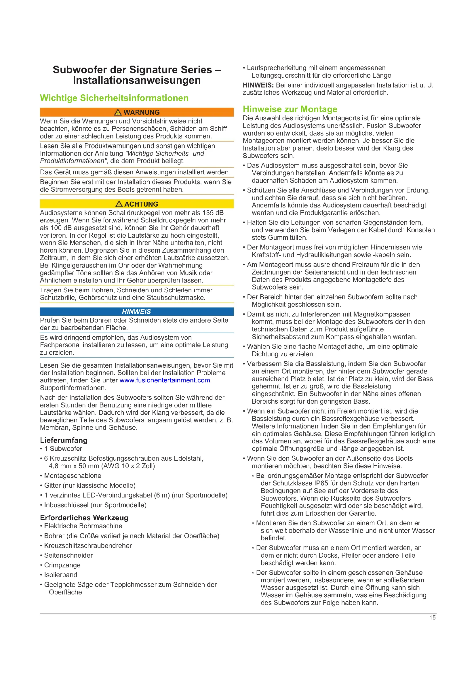 Diametro della porta 104 mm (4,0 poll.) Lunghezza della porta 265 mm (10,45 poll.) *Riempito completamente con materiale assorbente. **Rivestito con materiale assorbente. 14Subwoofer der Signature Series – Installationsanweisungen Wichtige Sicherheitsinformationen WARNUNG Wenn Sie die Warnungen und Vorsichtshinweise nicht beachten, könnte es zu Personenschäden, Schäden am Schiff oder zu einer schlechten Leistung des Produkts kommen. Lesen Sie alle Produktwarnungen und sonstigen wichtigen Informationen der Anleitung "Wichtige Sicherheits- und Produktinformationen", die dem Produkt beiliegt. Das Gerät muss gemäß diesen Anweisungen installiert werden. Beginnen Sie erst mit der Installation dieses Produkts, wenn Sie die Stromversorgung des Boots getrennt haben. ACHTUNG Audiosysteme können Schalldruckpegel von mehr als 135 dB erzeugen. Wenn Sie fortwährend Schalldruckpegeln von mehr als 100 dB ausgesetzt sind, können Sie Ihr Gehör dauerhaft verlieren. In der Regel ist die Lautstärke zu hoch eingestellt, wenn Sie Menschen, die sich in Ihrer Nähe unterhalten, nicht hören können. Begrenzen Sie in diesem Zusammenhang den Zeitraum, in dem Sie sich einer erhöhten Lautstärke aussetzen. Bei Klingelgeräuschen im Ohr oder der Wahrnehmung gedämpfter Töne sollten Sie das Anhören von Musik oder Ähnlichem einstellen und Ihr Gehör überprüfen lassen. Tragen Sie beim Bohren, Schneiden und Schleifen immer Schutzbrille, Gehörschutz und eine Staubschutzmaske. HINWEIS Prüfen Sie beim Bohren oder Schneiden stets die andere Seite der zu bearbeitenden Fläche. Es wird dringend empfohlen, das Audiosystem von Fachpersonal installieren zu lassen, um eine optimale Leistung zu erzielen. Lesen Sie die gesamten Installationsanweisungen, bevor Sie mit der Installation beginnen. Sollten bei der Installation Probleme auftreten, finden Sie unter www.fusionentertainment.com Supportinformationen. Nach der Installation des Subwoofers sollten Sie während der ersten Stunden der Benutzung eine niedrige oder mittlere Lautstärke wählen. Dadurch wird der Klang verbessert, da die beweglichen Teile des Subwoofers langsam gelöst werden, z. B. Membran, Spinne und Gehäuse. Lieferumfang