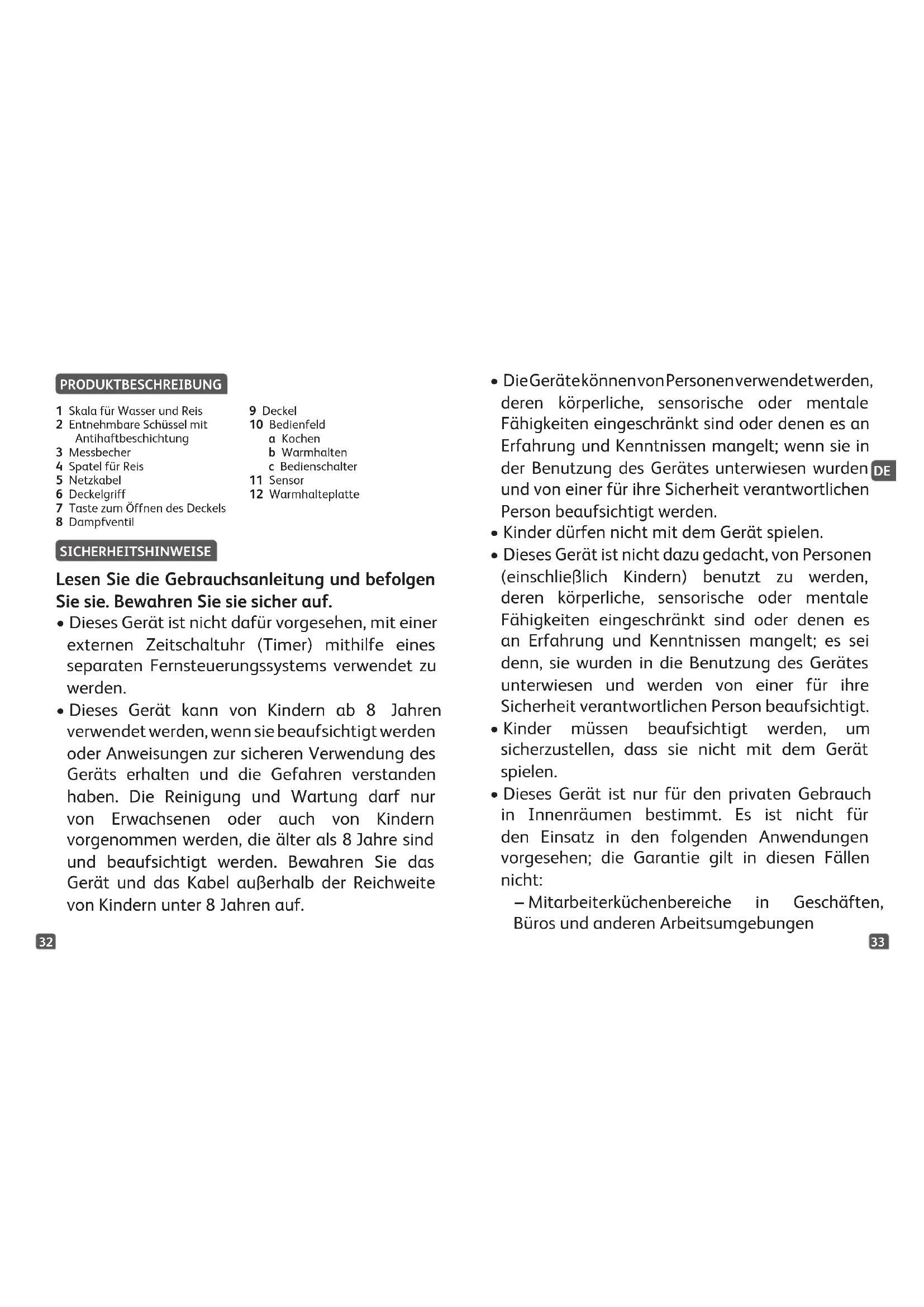 - Dieses Gerät kann von Kindern ab 8 Jahren verwendet werden, wenn sie beaufsichtigt werden oder Anweisungen zur sicheren Verwendung des Geräts erhalten und die Gefahren verstanden haben. Die Reinigung und Wartung darf nur von Erwachsenen oder auch von Kindern vorgenommen werden, die älter als 8Jahre sind und beaufsichtigt werden. Bewahren Sie das Gerät und das Kabel außerhalb der Reichweite von Kindern unter 8Jahren auf. PRODUKTBESCHREIBUNG 1 Skala für Wasser und Reis 2 Entnehmbare Schüssel mit Antihaftbeschichtung 3 Messbecher 4 Spatel für Reis 5 Netzkabel 6 Deckelgriff 7 Taste zum Öffnen des Deckels 8 Dampfventil 9 Deckel 10 Bedienfeld a Kochen b Warmhalten c Bedienschalter 11 Sensor 12 Warmhalteplatte