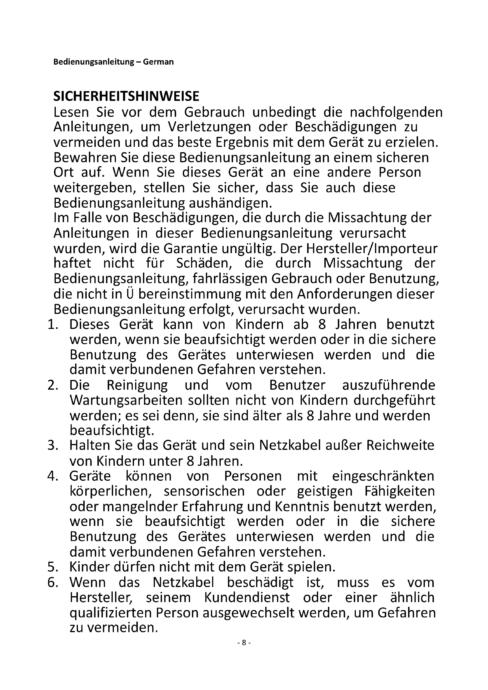 1. Dieses Gerät kann von Kindern ab 8 Jahren benutzt