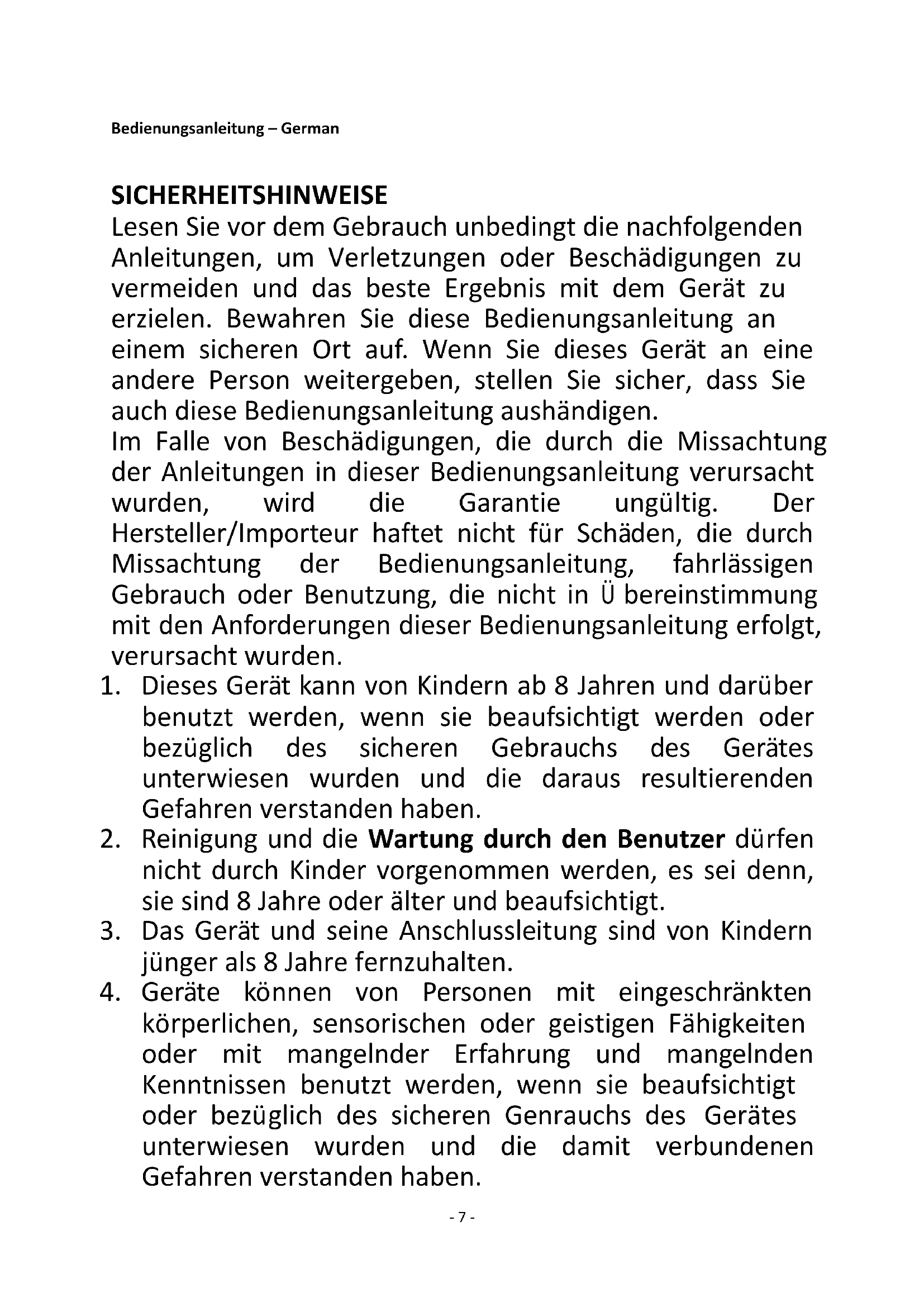 körperlichen, sensorischen oder geistigen Fähigkeiten oder mit mangelnder Erfahrung und mangelnden Kenntnissen benutzt werden, wenn sie beaufsichtigt oder bezüglich des sicheren Genrauchs des Gerätes unterwiesen wurden und die damit verbundenen Gefahren verstanden haben.- 8 -
