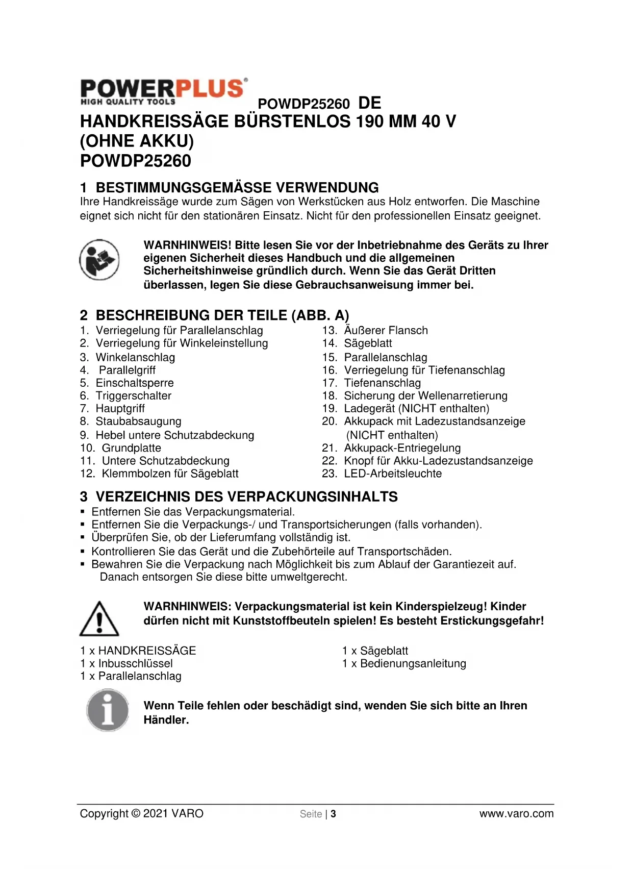 - Bewahren Sie die Verpackung nach Möglichkeit bis zum Ablauf der Garantiezeit auf. Danach entsorgen Sie diese bitte umweltgerecht. WARNHINWEIS: Verpackungsmaterial ist kein Kinderspielzeug! Kinder dürfen nicht mit Kunststoffbeuteln spielen! Es besteht Erstickungsgefahr! 1 x HANDKREISSÄGE 1 x Inbusschlüssel 1 x Parallelanschlag 1 x Sägeblatt 1 x Bedienungsanleitung Wenn Teile fehlen oder beschädigt sind, wenden Sie sich bitte an Ihren Händler.POWDP25260 DE Copyright © 2021 VARO Seite | 4 www.varo.com
