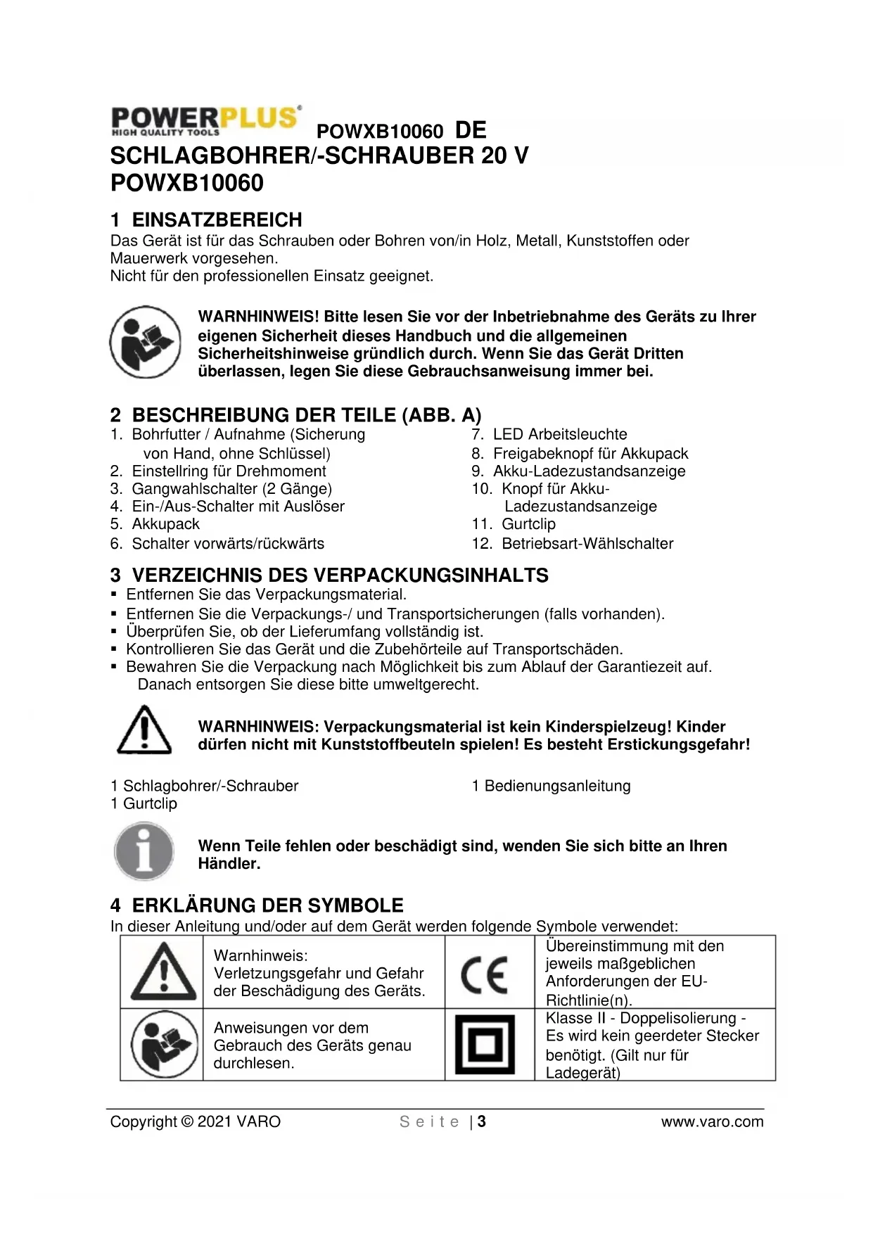 Klasse II - Doppelisolierung - Es wird kein geerdeter Stecker benötigt. (Gilt nur für Ladegerät)POWXB10060 DE Copyright © 2021 VARO S e i t e | 4 www.varo.com