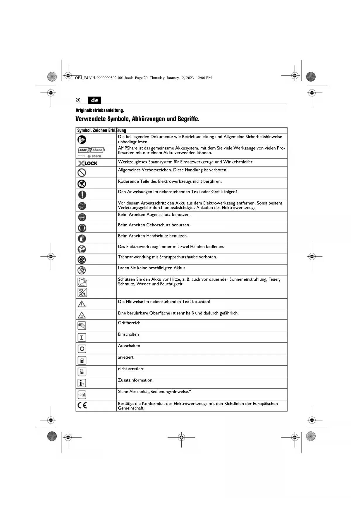 Originalbetriebsanleitung.Übersetzung der Originalbetriebsanleitung. Verwendete Symbole, Abkürzungen und Begriffe. Symbol, Zeichen Erklärung Die beiliegenden Dokumente wie Betriebsanleitung und Allgemeine Sicherheitshinweise unbedingt lesen. AMPShare ist das gemeinsame Akkusystem, mit dem Sie viele Werkzeuge von vielen Pro- fimarken mit nur einem Akku verwenden können. Werkzeugloses Spannsystem für Einsatzwerkzeuge und Winkelschleifer. Allgemeines Verbotszeichen. Diese Handlung ist verboten! Rotierende Teile des Elektrowerkzeugs nicht berühren. Den Anweisungen im nebenstehenden Text oder Grafik folgen! Vor diesem Arbeitsschritt den Akku aus dem Elektrowerkzeug entfernen. Sonst besteht Verletzungsgefahr durch unbeabsichtigtes Anlaufen des Elektrowerkzeugs. Beim Arbeiten Augenschutz benutzen. Beim Arbeiten Gehörschutz benutzen. Beim Arbeiten Handschutz benutzen. Das Elektrowerkzeug immer mit zwei Händen bedienen. Trennanwendung mit Schruppschutzhaube verboten. Laden Sie keine beschädigten Akkus. Schützen Sie den Akku vor Hitze, z. B. auch vor dauernder Sonneneinstrahlung, Feuer, Schmutz, Wasser und Feuchtigkeit. Die Hinweise im nebenstehenden Text beachten! Eine berührbare Oberfläche ist sehr heiß und dadurch gefährlich. Griffbereich Einschalten Ausschalten arretiert nicht arretiert Zusatzinformation. Siehe Abschnitt „Bedienungshinweise.“ Bestätigt die Konformität des Elektrowerkzeugs mit den Richtlinien der Europäischen Gemeinschaft. max.50°C OBJ_BUCH-0000000502-001.book Page 2 0 Thursday, January 12, 2023 12:06 PM21
