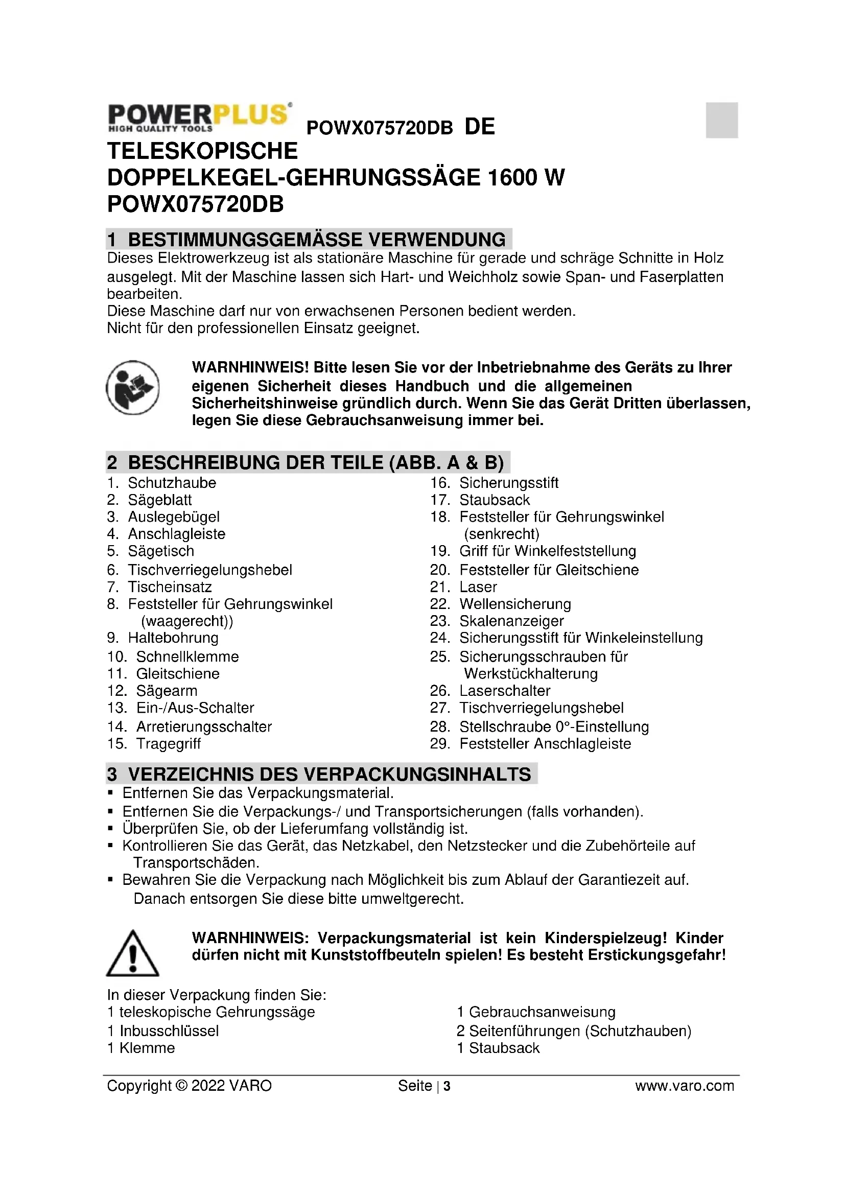 - Bewahren Sie die Verpackung nach Möglichkeit bis zum Ablauf der Garantiezeit auf. Danach entsorgen Sie diese bitte umweltgerecht. WARNHINWEIS: Verpackungsmaterial ist kein Kinderspielzeug! Kinder dürfen nicht mit Kunststoffbeuteln spielen! Es besteht Erstickungsgefahr! In dieser Verpackung finden Sie: 1 teleskopische Gehrungssäge 1 Inbusschlüssel 1 Klemme 1 Gebrauchsanweisung 2 Seitenführungen (Schutzhauben) 1 StaubsackPOWX075720DB DE Copyright © 2022 VARO Seite | 4 www.varo.com Wenn Teile fehlen oder beschädigt sind, wenden Sie sich bitte an Ihren Händler.