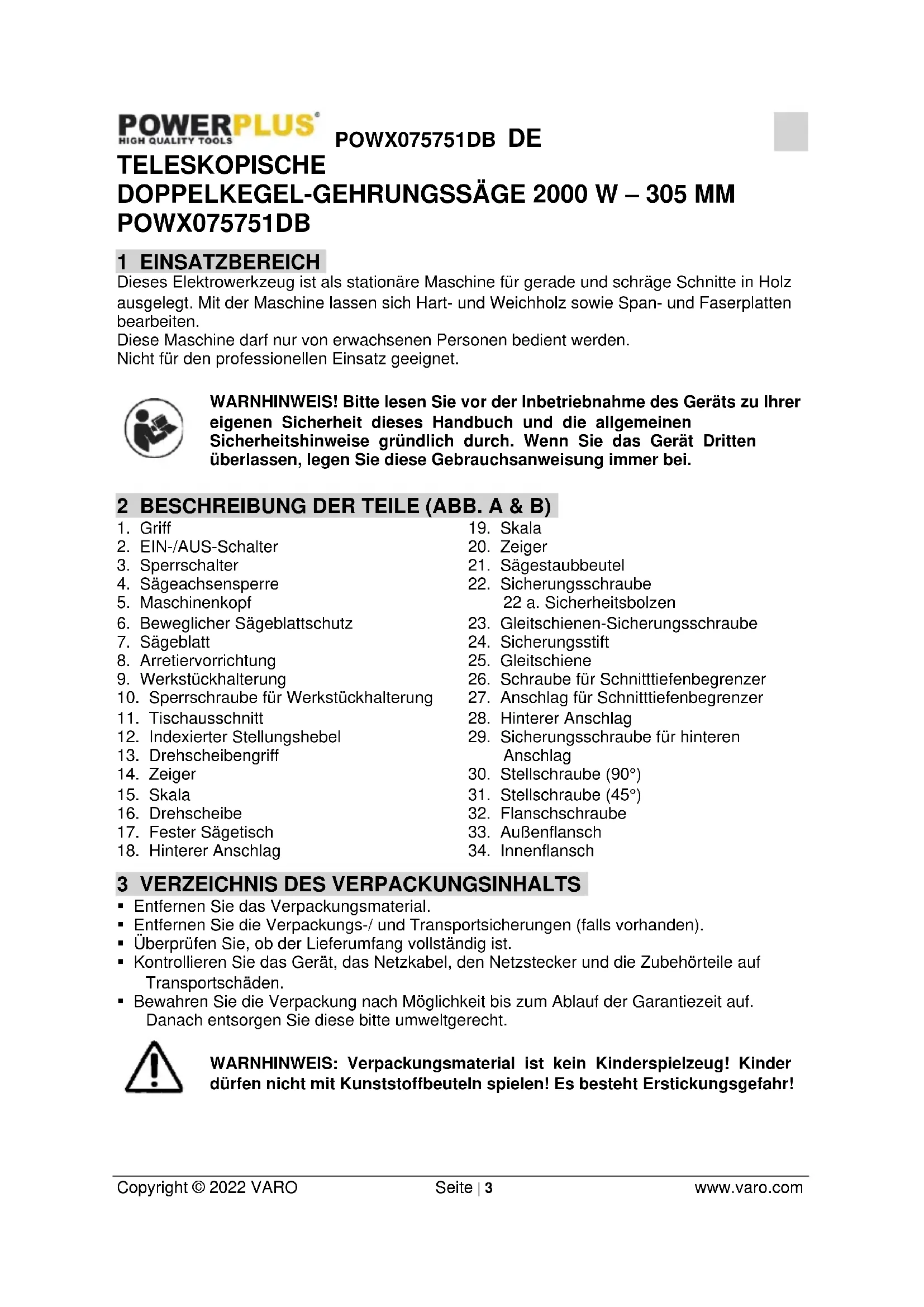 - Bewahren Sie die Verpackung nach Möglichkeit bis zum Ablauf der Garantiezeit auf. Danach entsorgen Sie diese bitte umweltgerecht. WARNHINWEIS: Verpackungsmaterial ist kein Kinderspielzeug! Kinder dürfen nicht mit Kunststoffbeuteln spielen! Es besteht Erstickungsgefahr!POWX075751DB DE Copyright © 2022 VARO Seite | 4 www.varo.com In dieser Verpackung finden Sie: 1 teleskopische Gehrungssäge 1 Sechskantschlüssel 1 Klemme 1 Gebrauchsanweisung 2 Auslegebügel 1 Staubsack 1 Sägeblatt : Ø 305 x 30 x 2,8mm (40T) Wenn Teile fehlen oder beschädigt sind, wenden Sie sich bitte an Ihren Händler.