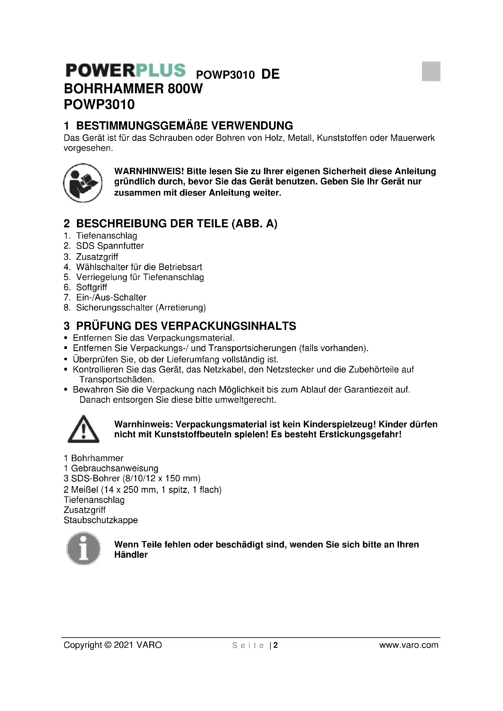 - Bewahren Sie die Verpackung nach Möglichkeit bis zum Ablauf der Garantiezeit auf. Danach entsorgen Sie diese bitte umweltgerecht. Warnhinweis: Verpackungsmaterial ist kein Kinderspielzeug! Kinder dürfen nicht mit Kunststoffbeuteln spielen! Es besteht Erstickungsgefahr! 1 Bohrhammer 1 Gebrauchsanweisung 3 SDS-Bohrer (8/10/12 x 150 mm) 2 Meißel (14 x 250 mm, 1 spitz, 1 flach) Tiefenanschlag Zusatzgriff Staubschutzkappe Wenn Teile fehlen oder beschädigt sind, wenden Sie sich bitte an Ihren HändlerPOWP3010 DE Copyright © 2021 VARO S e i t e | 3 www.varo.com