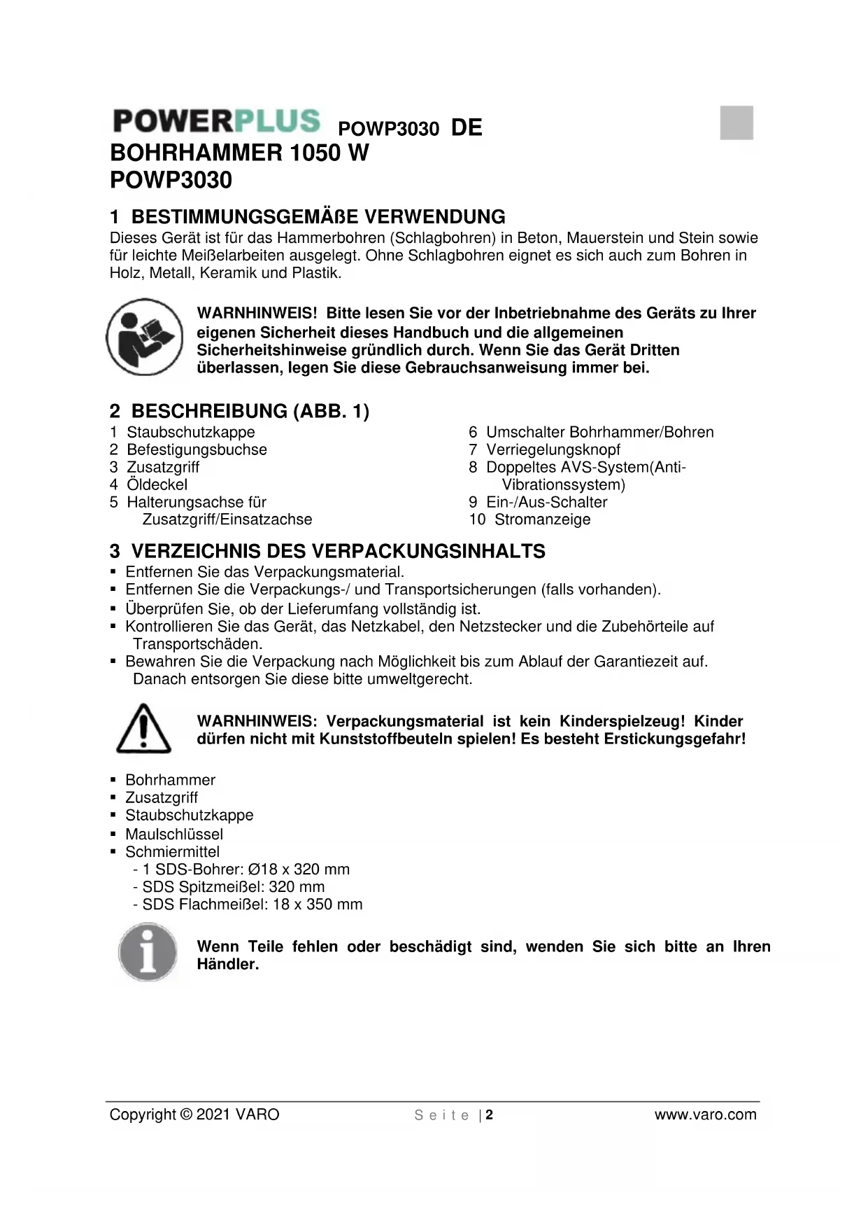 - Schmiermittel - 1 SDS-Bohrer: Ø18 x 320 mm - SDS Spitzmeißel: 320 mm - SDS Flachmeißel: 18 x 350 mm Wenn Teile fehlen oder beschädigt sind, wenden Sie sich bitte an Ihren Händler.POWP3030 DE Copyright © 2021 VARO S e i t e | 3 www.varo.com