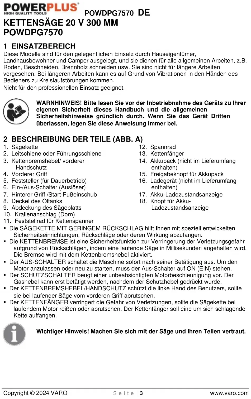 - Der KETTENFÄNGER verringert die Gefahr von Verletzungen, sollte die Sägekette bei laufendem Motor reißen oder abrutschen. Der Kettenfänger soll eine um sich schlagende Kette auffangen. Wichtiger Hinweis! Machen Sie sich mit der Säge und ihren Teilen vertraut.POWDPG7570 DE Copyright © 2024 VARO S e i t e | 4 www.varo.com WARNHINWEIS: Schützen Sie sich vor Rückschlägen. Halten Sie die Kettensäge während des Gebrauchs mit beiden Händen fest. Lesen und befolgen Sie zu Ihrer eigenen Sicherheit die Sicherheitshinweise in dieser Anleitung, bevor Sie die Kettensäge in Betrieb nehmen. Eine nicht bestimmungsgemäße Verwendung kann schwere Verletzungen verursachen. WARNHINWEIS: Bei der Arbeit mit kraftstoffbetriebenen Geräten müssen immer die nachstehenden Grundregeln beachtet werden, um das Risiko von Verletzungen und/oder Schäden am Gerät zu verringern.