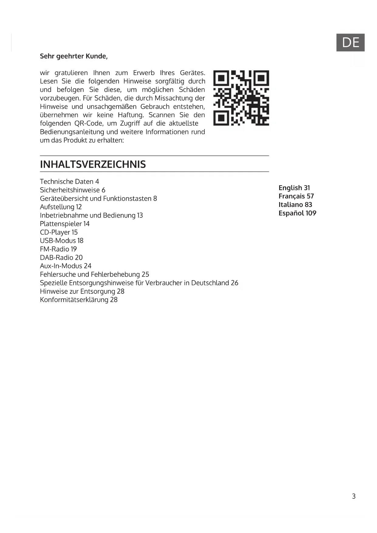 English 31 Français 57 Italiano 83 Español 109 Sehr geehrter Kunde, wir gratulieren Ihnen zum Erwerb Ihres Gerätes. Lesen Sie die folgenden Hinweise sorgfältig durch und befolgen Sie diese, um möglichen Schäden vorzubeugen. Für Schäden, die durch Missachtung der Hinweise und unsachgemäßen Gebrauch entstehen, übernehmen wir keine Haftung. Scannen Sie den folgenden QR-Code, um Zugri auf die aktuellste Bedienungsanleitung und weitere Informationen rund um das Produkt zu erhalten: INHALTSVERZEICHNIS Technische Daten 4 Sicherheitshinweise 6 Geräteübersicht und Funktionstasten 8 Aufstellung 12 Inbetriebnahme und Bedienung 13 Plattenspieler 14 CD-Player 15 USB-Modus 18 FM-Radio 19 DAB-Radio 20 Aux-In-Modus 24 Fehlersuche und Fehlerbehebung 25 Spezielle Entsorgungshinweise für Verbraucher in Deutschland 26 Hinweise zur Entsorgung 28 Konformitätserklärung 284