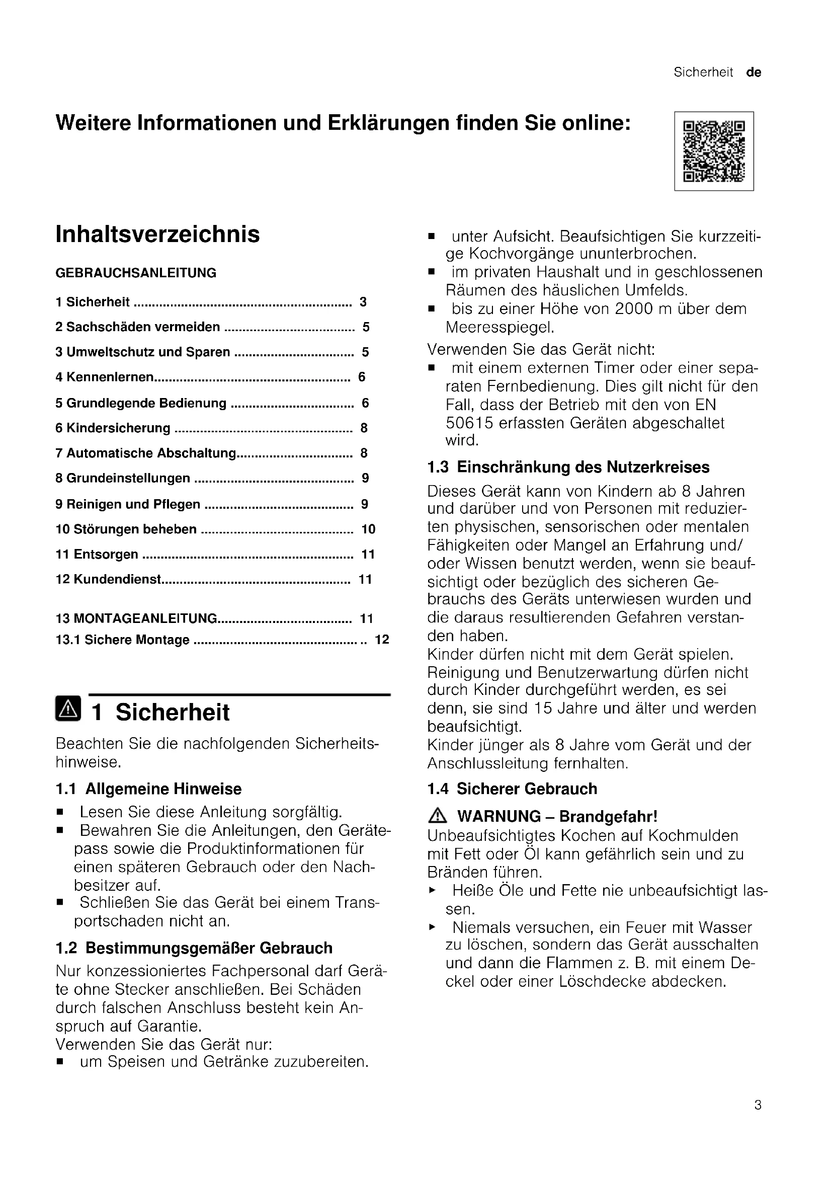 1 Sicherheit Beachten Sie die nachfolgenden Sicherheits- hinweise. 1.1 Allgemeine Hinweise ¡ Lesen Sie diese Anleitung sorgfältig. ¡ Bewahren Sie die Anleitungen, den Geräte- pass sowie die Produktinformationen für einen späteren Gebrauch oder den Nach- besitzer auf. ¡ Schließen Sie das Gerät bei einem Trans- portschaden nicht an. 1.2 Bestimmungsgemäßer Gebrauch Nur konzessioniertes Fachpersonal darf Gerä- te ohne Stecker anschließen. Bei Schäden durch falschen Anschluss besteht kein An- spruch auf Garantie. Verwenden Sie das Gerät nur: ¡ um Speisen und Getränke zuzubereiten. ¡ unter Aufsicht. Beaufsichtigen Sie kurzzeiti- ge Kochvorgänge ununterbrochen. ¡ im privaten Haushalt und in geschlossenen Räumen des häuslichen Umfelds. ¡ bis zu einer Höhe von 2000m über dem Meeresspiegel. Verwenden Sie das Gerät nicht: ¡ mit einem externen Timer oder einer sepa- raten Fernbedienung. Dies gilt nicht für den Fall, dass der Betrieb mit den von EN 50615 erfassten Geräten abgeschaltet wird. 1.3 Einschränkung des Nutzerkreises Dieses Gerät kann von Kindern ab 8 Jahren und darüber und von Personen mit reduzier- ten physischen, sensorischen oder mentalen Fähigkeiten oder Mangel an Erfahrung und/ oder Wissen benutzt werden, wenn sie beauf- sichtigt oder bezüglich des sicheren Ge- brauchs des Geräts unterwiesen wurden und die daraus resultierenden Gefahren verstan- den haben. Kinder dürfen nicht mit dem Gerät spielen. Reinigung und Benutzerwartung dürfen nicht durch Kinder durchgeführt werden, es sei denn, sie sind 15 Jahre und älter und werden beaufsichtigt. Kinder jünger als 8 Jahre vom Gerät und der Anschlussleitung fernhalten. 1.4 Sicherer Gebrauch WARNUNG‒Brandgefahr! Unbeaufsichtigtes Kochen auf Kochmulden mit Fett oder Öl kann gefährlich sein und zu Bränden führen. ▶ Heiße Öle und Fette nie unbeaufsichtigt las- sen. ▶ Niemals versuchen, ein Feuer mit Wasser zu löschen, sondern das Gerät ausschalten und dann die Flammen z. B. mit einem De- ckel oder einer Löschdecke abdecken.de Sicherheit