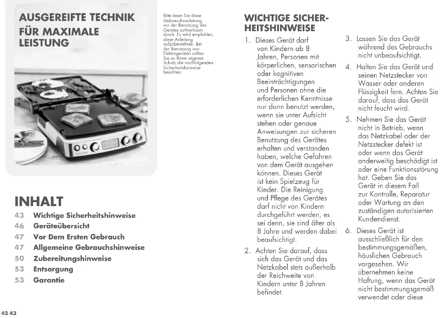 GEBRAUCHSANLEITUNG & GARANTIEBESTIMMUNGEN42 43 INHALT Wichtige SicherheitshinweiseGeräteübersichtVor Dem Ersten GebrauchAllgemeine GebrauchshinweiseZubereitungshinweiseEntsorgungGarantie