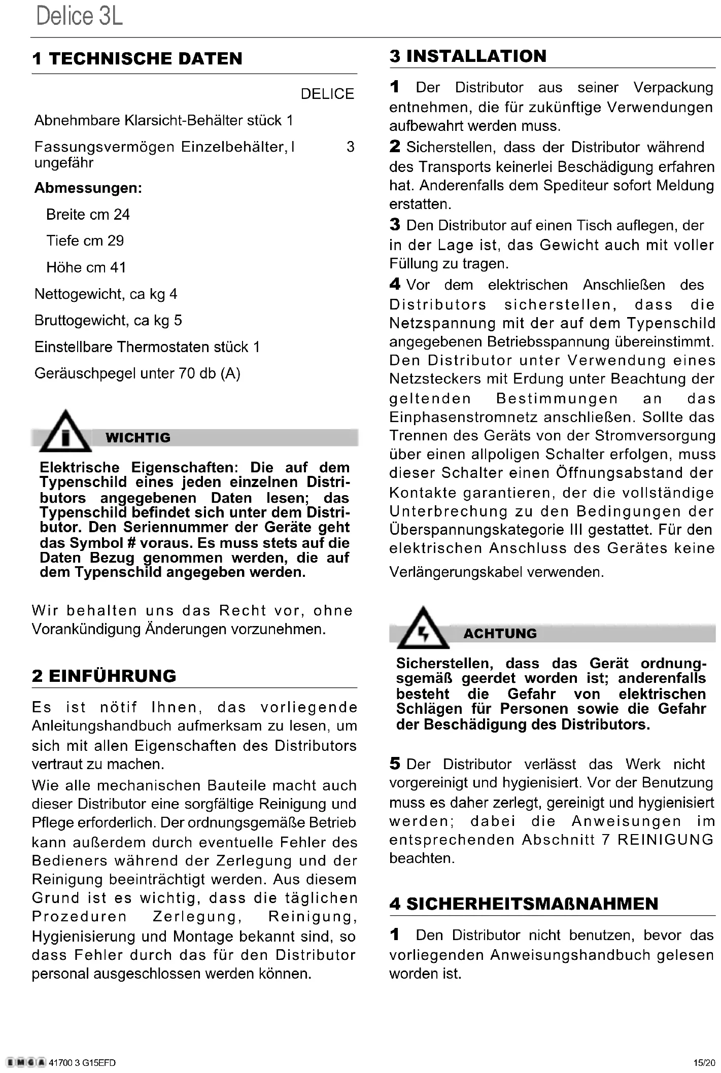 Den Distributor nicht benutzen, bevor das vorliegenden Anweisungshandbuch gelesen worden ist. DELICE Abnehmbare Klarsicht-Behälter stück 1 Fassungsvermögen Einzelbehälter, ungefähr l 3 Abmessungen: Breite cm 24 Tiefe cm 29 Höhe cm 41 Nettogewicht, ca kg 4 Bruttogewicht, ca kg 5 Einstellbare Thermostaten stück 1 Geräuschpegel unter 70 db (A) WICHTIG Elektrische Eigenschaften: Die auf dem Typenschild eines jeden einzelnen Distri- butors angegebenen Daten lesen; das Typenschild befindet sich unter dem Distri- butor. Den Seriennummer der Geräte geht das Symbol # voraus. Es muss stets auf die Daten Bezug genommen werden, die auf dem Typenschild angegeben werden. ACHTUNG Sicherstellen, dass das Gerät ordnung- sgemäß geerdet worden ist; anderenfalls besteht die Gefahr von elektrischen Schlägen für Personen sowie die Gefahr der Beschädigung des Distributors.41700 3 G15EFD 16/20