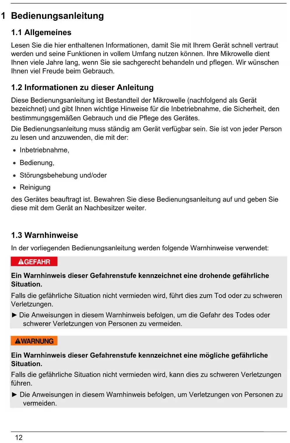 Diese Bedienungsanleitung ist Bestandteil der Mikrowelle (nachfolgend als Gerät bezeichnet) und gibt Ihnen wichtige Hinweise für die Inbetriebnahme, die Sicherheit, den bestimmungsgemäßen Gebrauch und die Pflege des Gerätes. Die Bedienungsanleitung muss ständig am Gerät verfügbar sein. Sie ist von jeder Person zu lesen und anzuwenden, die mit der: Inbetriebnahme, Bedienung, Störungsbehebung und/oder Reinigung des Gerätes beauftragt ist. Bewahren Sie diese Bedienungsanleitung auf und geben Sie diese mit dem Gerät an Nachbesitzer weiter.