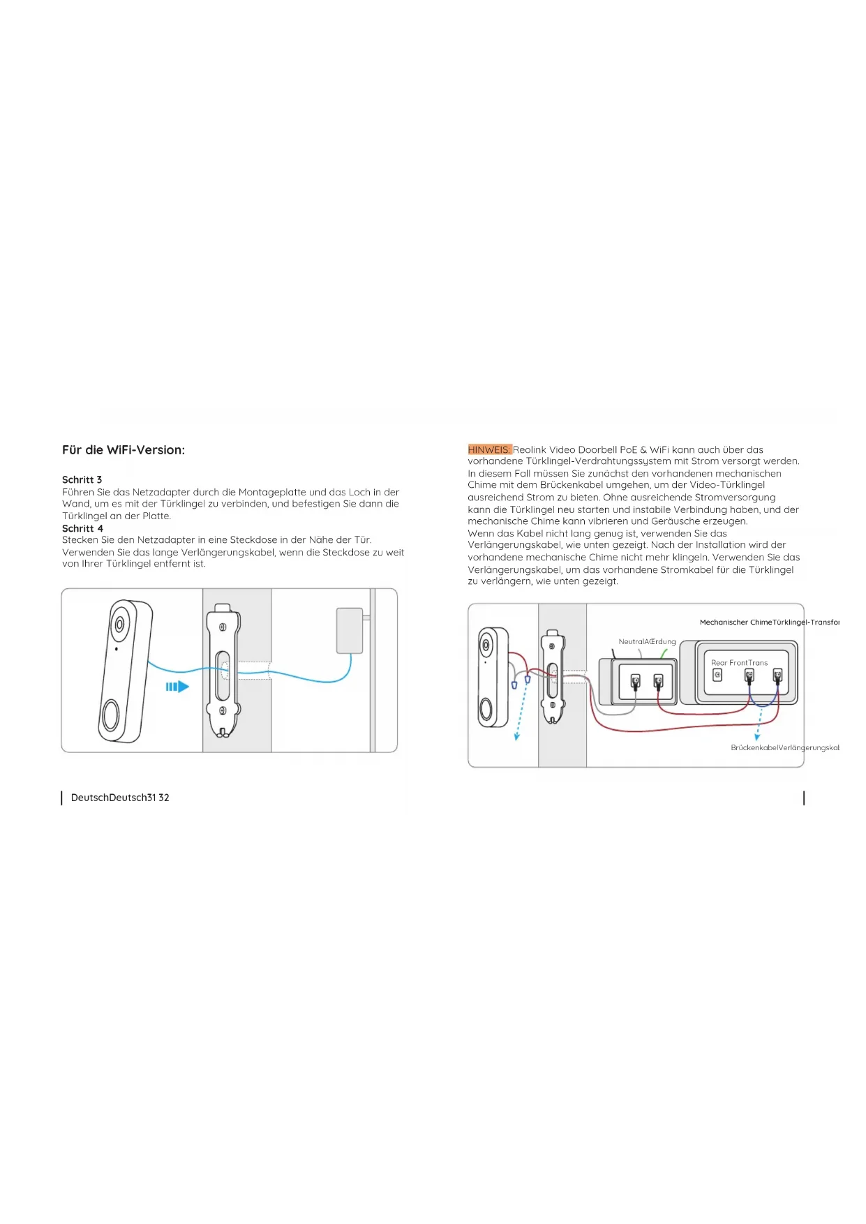 - HilfebeidemHändlerodereinemerfahrenenRadio-/TV-Techniker finden. Achtung:ÄnderungenoderModifikationen,dienichtausdrücklichvon derfürdieKonformitätverantwortlichenParteigenehmigtsind,können BerechtigungdesBenutzerszumBetriebdesGerätesaufheben. Reolinkerklärt,dassdieWLAN-KameradengrundlegendenAnforderun- genundanderenrelevantenBestimmungenderRichtlinie2014/53/EU Vereinfachte EU-Konformitätserklärung DiesesGerätentsprichtdenFCC-GrenzwertenfürdieStrahlenbelas- tung,diefüreineunkontrollierteUmgebungfestgelegtwurden.Dieses GerätmussmiteinemMindestabstandvon20cmzwischenderStrah- lungsquelleundIhremKörperinstalliertundbetriebenwerden. FCC-Erklärung zur Strahlenbelastung entspricht,diePoE-KameraderRichtlinie2014/30/EU. DiesesProduktwirdmiteinerbeschränkten2-Jahres-Garantiegeliefert, dienurbeimKaufimoffiziellenReolink-Shopoderbeieinemautorisierten Reolink-Händlergültigist.Mehrerfahren:https://reolink.com/warran- ty-and-return/. Beschränkte Garantie HINWEIS:HoffentlichgefälltIhnendiesesProdukt.SolltenSiedennoch mitdemProduktnichtzufriedensindundeszurückgebenmöchten, empfehlenwirdieKameraaufdieWerkseinstellungenzurückzusetzen, bevor Sie sie zurücksenden. DasZeichenbedeutet,dassdasProduktinderganzenEUnichtmitan- derenHaushaltsabfällenentsorgtwerdendarf.UmmöglicheSchädenfür dieUmweltoderdiemenschlicheGesundheitzuvermeiden,recycelnSie esambestenaufeinegeeigneteWeise.UmIhrAltgerätzurückzugeben, nutzenSiebittedieRückgabe-undSammelsystemeoderwendenSie sichandenHändler,beidemSiedasProduktgekaufthaben.Dortkann mandasProdukteinemumweltgerechtenRecyclingzuführen. Richtige Entsorgung des Produktes DieNutzungdesProduktesunterliegtIhrerZustimmungzudenAGB& derDatenschutzrichtlinieaufreolink.com.HaltenSiedasvonKindern fern. AGB & DatenschutzDeutsch Deutsch39 40 DiesesGerätenthältlizenzbefreite(n)Sender/Empfänger,dieden lizenzbefreitenRSS-Standard(s)vonInnovation,ScienceandEconomic DevelopmentCanadaentsprechen.DerBetriebunterliegtdenfolgenden zwei Bedingungen: (1)DiesesGerätdarfkeineStörungenverursachen. (2)DiesesGerätmussalleInterferenzenakzeptieren,einschließlich Interferenzen,dieeinenunerwünschtenBetriebdesGerätsverursachen können. L’émetteur/récepteurexemptdelicencecontenudansleprésent appareilestconformeauxCNRd’Innovation,SciencesetDéveloppement économiqueCanadaapplicablesauxappareilsradioexemptsdelicence. L’exploitationestautoriséeauxdeuxconditionssuivantes: (1)L’appareilnedoitpasproduiredebrouillage; (2)L’appareildoitacceptertoutbrouillage radioélectriquesubi,mêmesilebrouillageestsusceptibled’en compromettrelefonctionnement. ISED-Konformitätserklärung Durch die Verwendung der in das Reolink-Produkt integrierten ProduktsoftwarestimmenSiedenBestimmungendiesesEndbenutzer- Lizenzvertrags(„EULA“)zwischenIhnenundReolinkzu.Mehrerfahren: https://reolink.com/eula/. Endbenutzer-Lizenzvertrag DiesesGerätwurdeebenfallsbewertetunderfülltdieIC-Grenzwerte fürallgemeineHF-BelastunguntermobilenExpositionsbedingungen. ZwischendemSenderundIhremKörperisteinMindestabstandvon20 cm einzuhalten. Déclarationd’expositionauxradiofréquencespourIC L’appareilaétéévaluépourrépondreauxexigencesgénéralesen matièred’expositionauxRF.L’appareilpeutêtreutilisédansdes conditions d’exposition mobiles. Ladistancedeséparationminimaleestde20cm. IC-Erklärung zur Strahlenbelastung BETRIEBSFREQUENZ (für die WiFi-Version) (die maximale Sendeleistung) WennSietechnischeHilfebenötigen,besuchenSiebitteunsereoffizielle Support-WebsiteundkontaktierenSieunserSupport-Team,bevorSiedie Produktezurückschicken:https://support.reolink.com. Technischer Support DieFunktionenvondrahtlosenZugangssystemeneinschließlich lokalerFunknetze(WAS/RLANs)imFrequenzband5150-5350MHz fürdiesesGerätsindinallenLändernderEuropäischenUnion (BE/BG/CZ/DK/DE/EE/IE/EL/ES/FR/HR/IT/CY/LV/LT/LU/HU/ MT/NL/AT/PL/PT/RO/SI/SK/FI/SE/TR/NO/CH/IS/LI/UK(NI))aufden Innenraumbetriebbeschränkt. 2.4GHzEIRP<20dBm 5 GHz EIRP<23dBm 5.8GHzEIRP<14dBm 868MHzEIRP<14dbmFrançais Français41 42 ContenudelaBoîte 42 Introduction à la Sonnette 43 Mise en Place de la Sonnette 45 Installation de la Sonnette 49 Retrait de la Sonnette 55 Caractéristiques 56 NoticationdeConformité 56 Contenu de la Boîte Guide de Démarrage Rapide Sonnette Carillon Gabarit des Trous de Montage Sachet de Vis Câble d’Extension Plaque de Montage Câble Ethernet de 1M Socle d’Angle Câble de Raccordement Câble d’Extension d’Alimentation* Adaptateur Secteur*