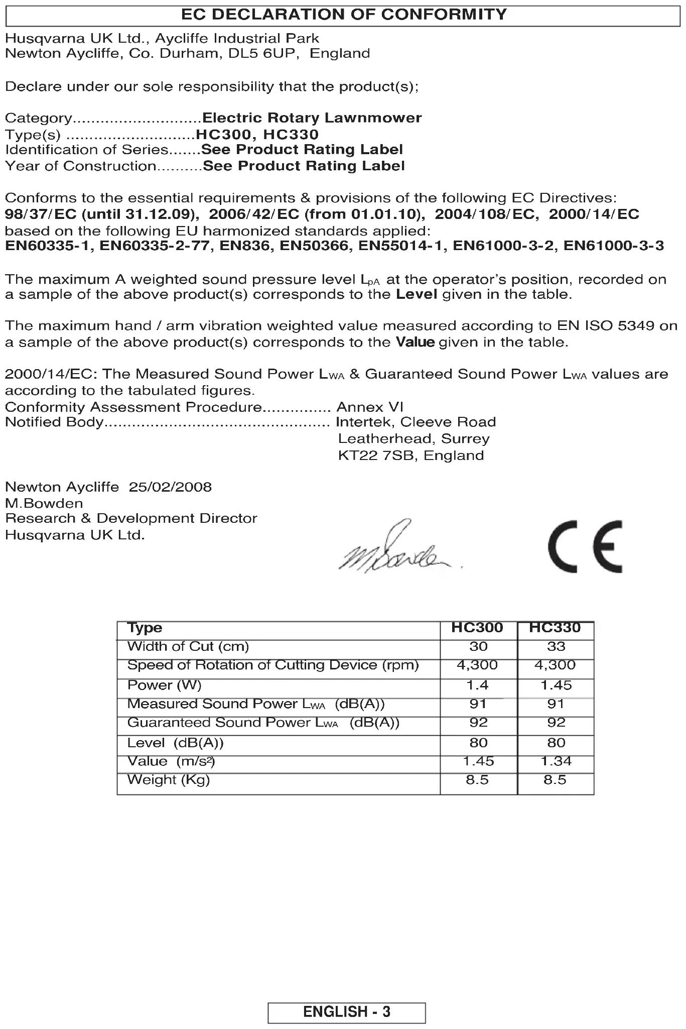 - Ihr Gerät sollte mindestens alle 12 Monate gewartet werden; häufiger, wenn es professionell eingesetzt wird.EC KONFORMITÄTSERKLÄRUNG Husqvarna UK Ltd., Aycliffe Industrial Park Newton Aycliffe, Co. Durham, DL5 6UP, England erklären in alleiniger Verantwortung, dass das Produkt bzw. die Produkte Kategorie...........................Elektrischer Rotationsrasenmäher Typ ............................HC300, HC330 Identifizierung der reihe.........Siehe Produkttypenschild Baujahr...............................Siehe Produkttypenschild die maßgeblichen Anforderungen und Bestimmungen der folgenden EU-Richtlinien erfüllt/er- füllen: 98/37/EEC (bis 31.12.09), 2006/42/EC (ab 01.01.10), 2004/108/EC, 2000/14/EC beruhend auf den folgenden in der EU harmonisierten, anwendbaren Standards: EN60335-1, EN60335-2-77, EN836, EN50366, EN55014-1, EN61000-3-2, EN61000-3-3 Der maximale A-Schalldruckpegel L