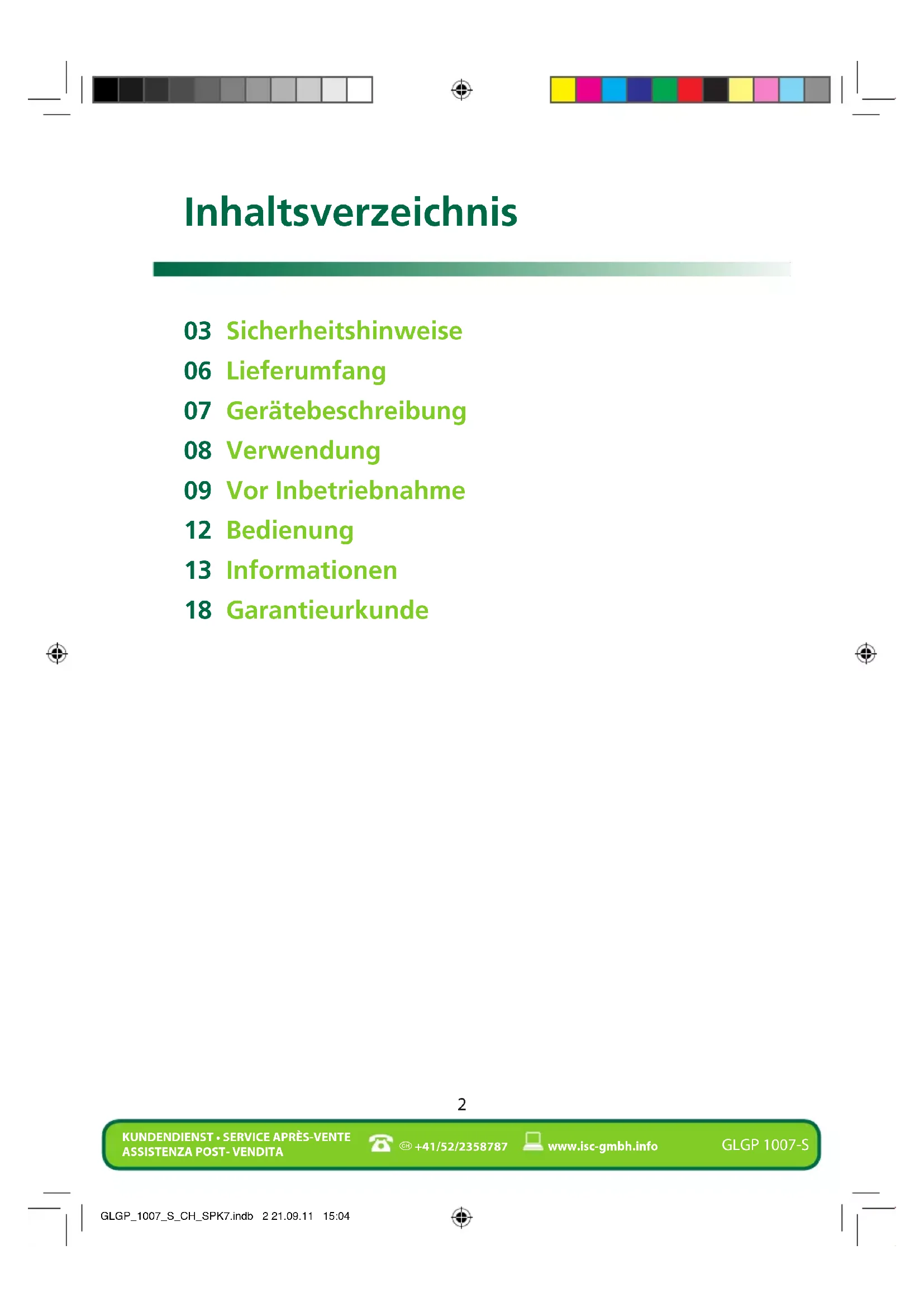+41/52/2358787 www.isc-gmbh.info GLGP 1007-S Inhaltsverzeichnis 03 Sicherheitshinweise 06 Lieferumfang 07 Gerätebeschreibung 08 Verwendung 09 Vor Inbetriebnahme 12 Bedienung 13 Informationen 18 Garantieurkunde GLGP_1007_S_CH_SPK7.indb 2 21.09.11 15:043