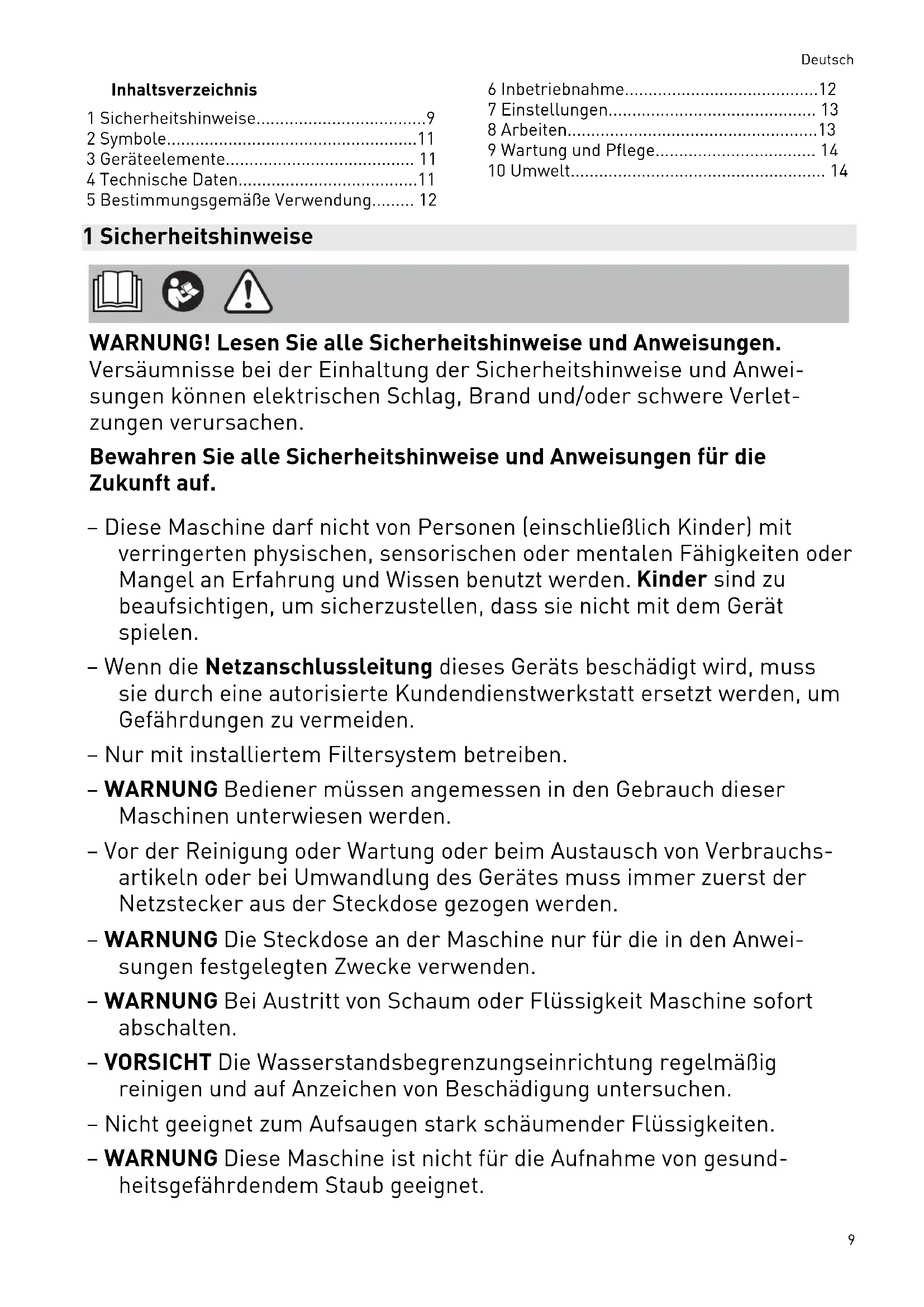 2400W 1100W 1800W 2300W Volumenstrom (Luft) max., Sauger/Turbine 130m³/h / 222m³/h Unterdruck max., Turbine 24000Pa Saugschlauch D27/32mmx3,5m-RAS/CT Länge der Netzanschlussleitung 5,5m Schalldruckpegel nach EN 60335-2-69/ UnsicherheitK 72dB(A)/3dB Hand-Arm Vibrationswert nach EN 60335-2-69/ UnsicherheitK <2,5m/s²/ 1,5m/s² Schutzart IPX4 Behälterinhalt CT15 15l CT25 25l Deutsch 11Absaugmobile CT15 CT25 Abmessung LxBxH CT15 470x320x430mm CT25 470x320x510mm Gewicht CT15 10,5kg CT25 11,3kg 5 Bestimmungsgemäße Verwendung Absaugmobil geeignet zum – Auf- und Absaugen von nicht gesundheits gefährdenden Stäuben, Schmutz, Sand, Späne, – Aufsaugen von Wasser, – für erhöhte Beanspruchung bei gewerbli cher Nutzung, gemäß IEC/EN 60335-2-69. Das Absaugmobil ist nur für den Innenbereich geeignet. Bei nicht bestimmungsgemäßem Gebrauch haftet der Benutzer. 6 Inbetriebnahme
