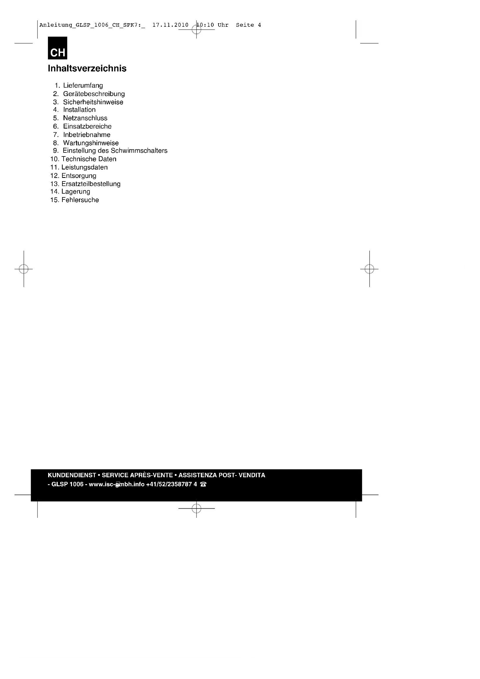 Störungen Ursachen Abhilfe Pumpe läuft nicht an – Netzspannung fehlt – Schwimmschalter schaltet nicht – Netzspannung überprüfen – Schwimmschalter in höhere Stellung bringen Pumpe fördert nicht – Einlaufsieb verstopft – Druckschlauch geknickt – Einlaufsieb mit Wasser- strahl reinigen – Knickstelle beheben Pumpe schaltet nicht aus – Schwimmschalter kann nicht absinken – Pumpe auf dem Schacht- boden richtig auflegen Fördermenge ungenügend – Einlaufsieb verstopft – Pumpenleistung verringert, durch stark verschmutzte und schmirgelnde Wasserbeimengungen – Einlaufsieb reinigen – Pumpe reinigen und Verschleißteile ersetzen Pumpe schaltet nach kurzer Laufzeit ab – Motorschutz schaltet die Pumpe wegen zu starker Wasserverschmutzung ab – Wassertemperatur zu hoch, Motorschutz schaltet ab – Netzstecker ziehen und Pumpe sowie Schacht reinigen. – Auf maximale Wasser- Temperatur von 35° C achten! KUNDENDIENST • SERVICE APRÈS-VENTE • ASSISTENZA POST- VENDITA - GLSP 1006 - www.isc-gmbh.info +41/52/2358787 10 Anleitung_GLSP_1006_CH_SPK7:_ 17.11.2010 10:10 Uhr Seite 10Table des matières