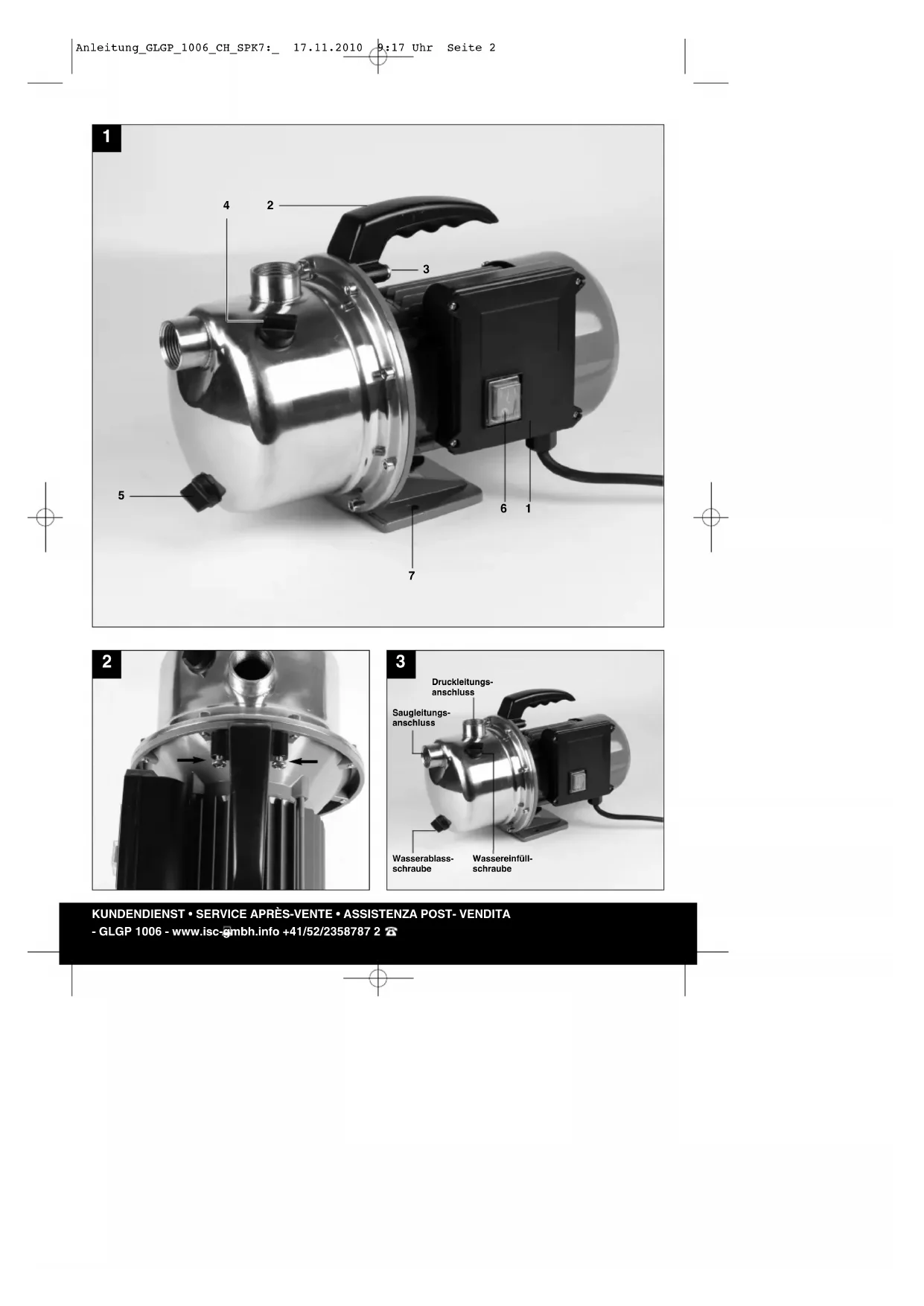 Saugleitungs- anschluss Wasserablass- schraube Druckleitungs- anschluss Wassereinfüll- schraube Anleitung_GLGP_1006_CH_SPK7:_ 17.11.2010 9:17 Uhr Seite 2CH KUNDENDIENST • SERVICE APRÈS-VENTE • ASSISTENZA POST- VENDITA - GLGP 1006 - www.isc-gmbh.info +41/52/2358787 3 Inhaltsverzeichnis