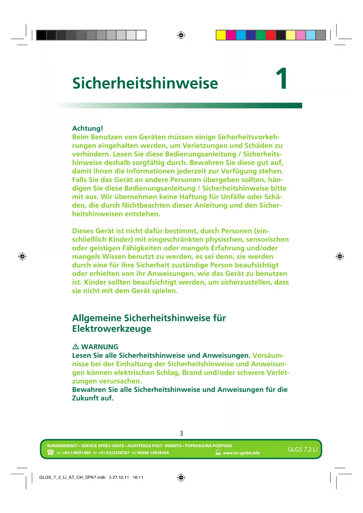 KUNDENDIENST • SERVICE APRÈS-VENTE • ASSISTENZA POST- VENDITA • POPRODAJNA PODPORA www.isc-gmbh.info GLGS 7,2 Li Der in den Sicherheitshinweisen verwendete Begriff „Elektro- werkzeug“ bezieht sich auf netzbetriebene Elektrowerkzeuge (mit Netzkabel) und auf akkubetriebene Elektrowerkzeuge (ohne Netzkabel).
