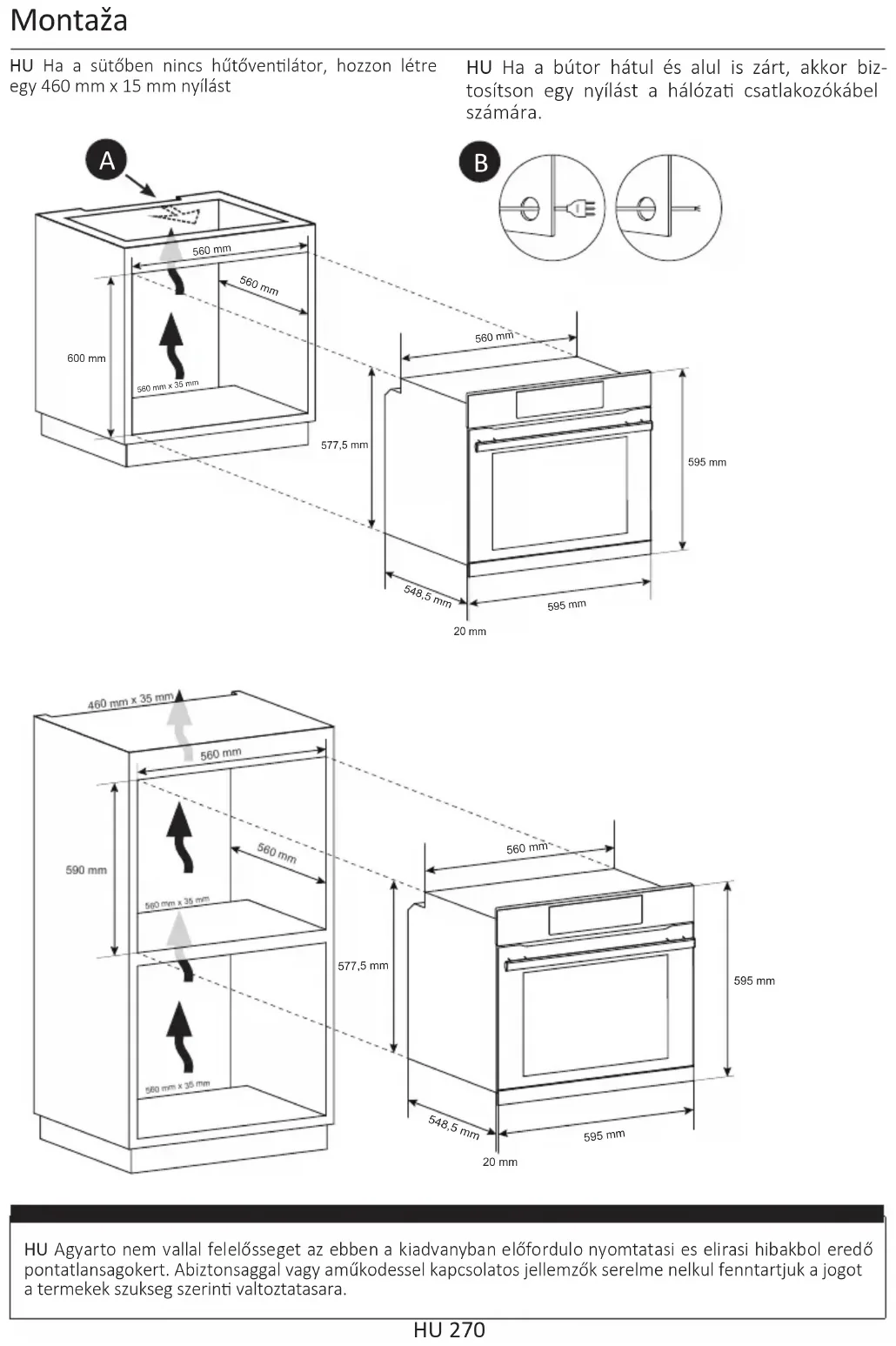 - Der Backofen kann oben in einem Einbauschrank oder unter der Arbeitsäche eingebaut werden. Vor dem Fixieren muss gewährleistet sein, dass im Backofenraum genügend Frischlu zirkulieren kann, um die Kühlung und den Schutz der innenliegen- den Teile zu gewährleisten. Je nach Einbauart die auf der letzten Seite angegebenen Önungen vornehmen.
