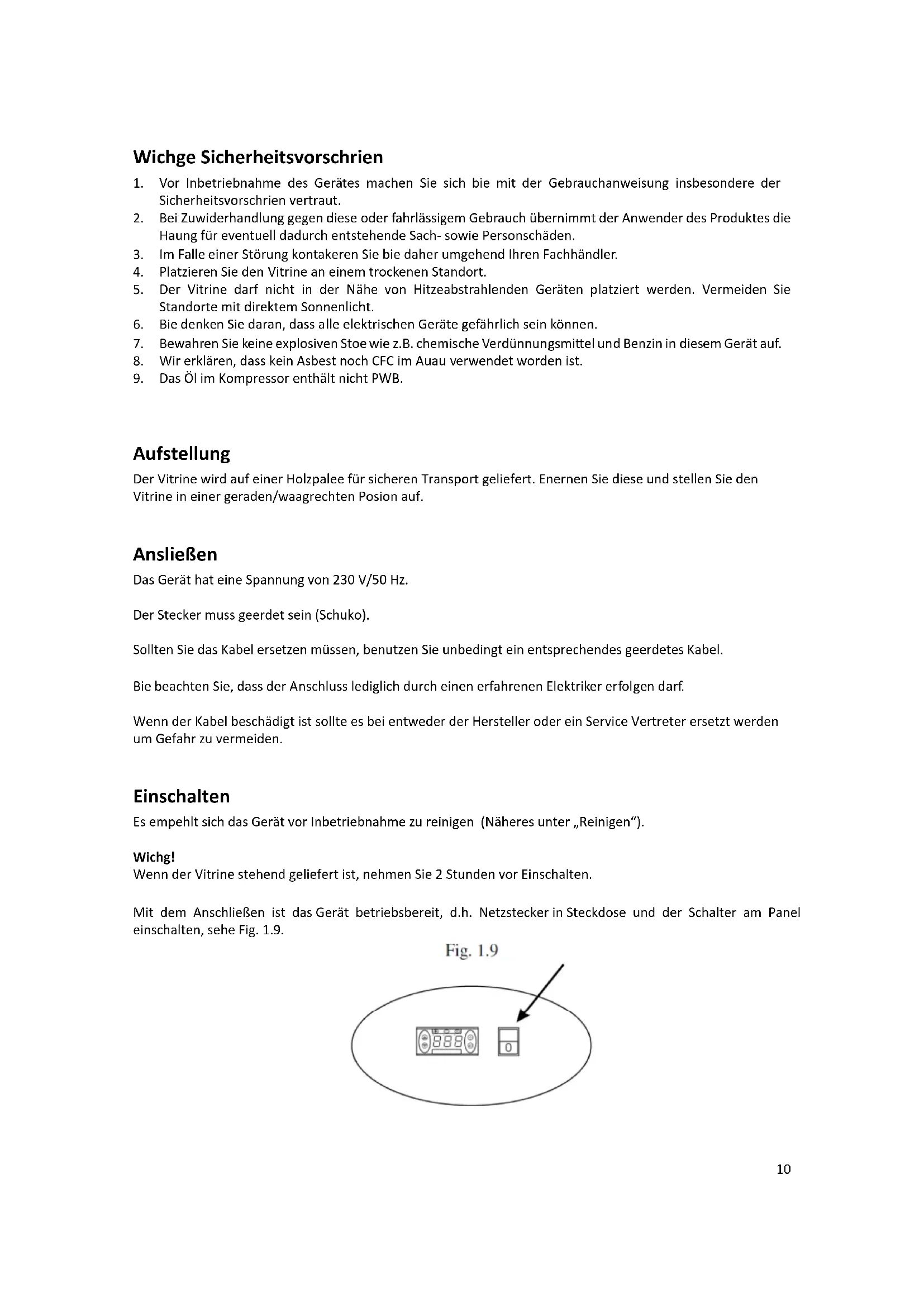 Aufstellung Der Vitrine wird auf einer Holzpalette für sicheren Transport geliefert. Entfernen Sie diese und stellen Sie den Vitrine in einer geraden/waagrechten Position auf. Ansließen Das Gerät hat eine Spannung von 230 V/50 Hz. Der Stecker muss geerdet sein (Schuko). Sollten Sie das Kabel ersetzen müssen, benutzen Sie unbedingt ein entsprechendes geerdetes Kabel. Bitte beachten Sie, dass der Anschluss lediglich durch einen erfahrenen Elektriker erfolgen darf. Wenn der Kabel beschädigt ist sollte es bei entweder der Hersteller oder ein Service Vertreter ersetzt werden um Gefahr zu vermeiden. Einschalten Es empfiehlt sich das Gerät vor Inbetriebnahme zu reinigen (Näheres unter „Reinigen“). Wichtig! Wenn der Vitrine stehend geliefert ist, nehmen Sie 2 Stunden vor Einschalten. Mit dem Anschließen ist das Gerät betriebsbereit, d.h. Netzstecker in Steckdose und der Schalter am Panel einschalten, sehe Fig. 1.9.11 Temperaturregelung Der Regler ist im Kontrollpaneel plaziert, siehe Fig. 2.0. Fig. 2.0 Der Regler ist voreingestellt für den Vitrine und normalerweise es ist nicht notwendig die Einstellung zu regulieren. Bei Anschließen zeigt das Display die aktuelle Temperatur im Vitrine. Eingestellt Temperatur gezeigt Drücken Sie auf diesen Taster und Display zeigt die eingestellte Temperatur. Nochmal drücken um normale Temperatur zu zeigen Neue Temperatur einstellen: Drücken Sie auf diesen Taster mehr als 3 Sekunden und Display zeigt die eingestellt Temperatur. Drücken Sie auf diesen Taster um die eingestellte Temperatur zu erhöhen.